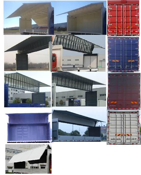 | 备注 | 车厢顶部顶板与侧翼板固定连接在一起可开启.选装平顶驾驶室,高顶驾驶室选装超大保险杠、导流罩、驻车空调,选装前围装饰件及前部灯具,选装后视镜,选装车门下装饰板,选装LED前后组合灯. | ||||||||||