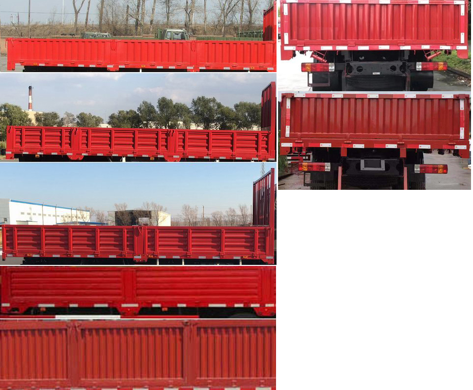 | 备注 | 选装无遮阳罩,选装三级脚踏板,选装竖栏板,选装二截板,三截板,选装横瓦楞,竖瓦楞,选装平顶驾驶室,选装改脸驾驶室,选装顶置空调,选装油箱样式选装导流罩.高度尺寸对应关系:2950,3100,3150(平顶),3600,3650,3750(高顶),3800,3850(平顶导流罩).长度尺寸对应关系:9100=1400+1900+3800+2000(6800mm厢长),9500=1400+1900+4000+2200(7200mm厢长),10000=1400+1900+4300+2400(7700mm厢长),11000=1400+1900+4700+3000(8700mm厢长),12000=1400+1900+5600+3100(9700mm厢长).货箱长与水平承载面系固点数量对应关系:6800(14),7200(16),7700(18),8700(20),9700(22).整备质量与轴距对应关系:8270对应1900+3800,8370对应1900+4000,8470对应1900+4300,8670对应1900+4700,8970对应1900+5600.前轴为鼓式制动器对应车速89km/h,装备ABS,无轮胎气压监测装置,无车道偏离预警系统,无制动器衬片更换报警装置,无AEBS,无ESC;前轴为盘式制动器对应车速96km/h,装备EBS、ESC、AEBS、轮胎气压监测装置、车道偏离预警系统,制动器衬片更换报警装置. | ||||||||||