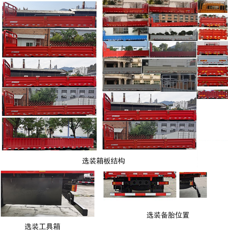 | 备注 | 选装箱板结构,选装工具箱,选装备胎位置,选装不同材质和容积的燃油箱,选装储气筒位置. | ||||||||||