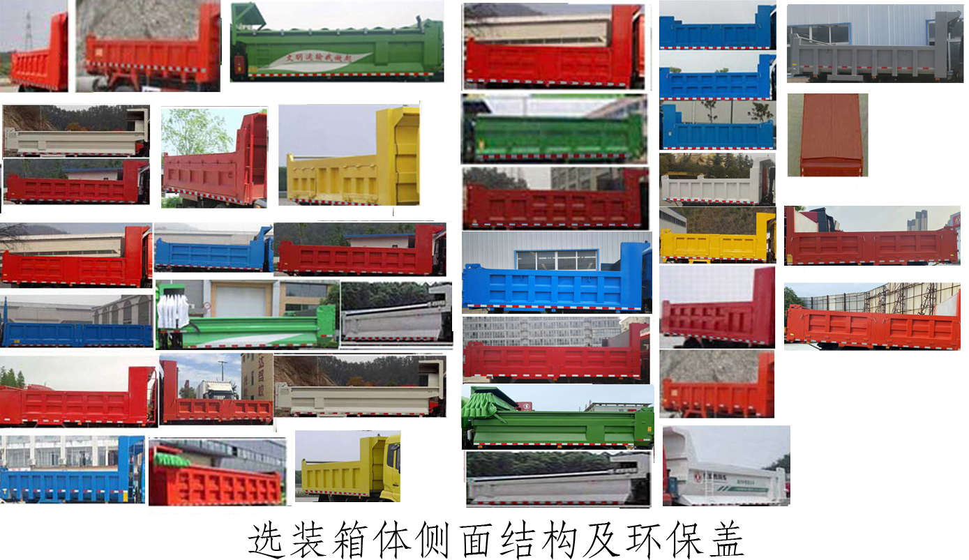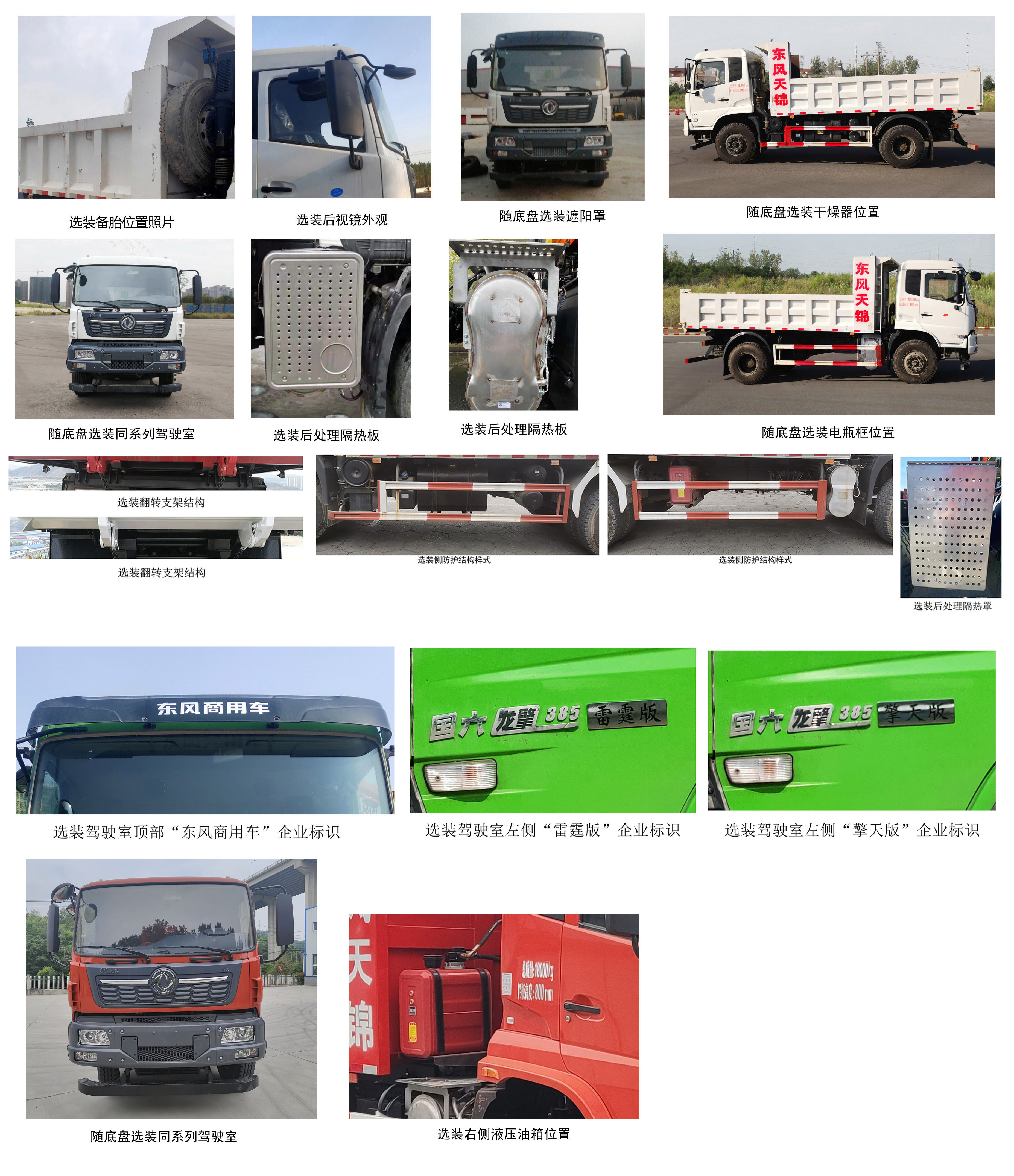 | 备注 | 外廓尺寸长/轴距/后悬对应关系:7225/3800/1950,7625/4200/1950,8025/4500/2050,8325/4700/2150,7725/4200/2050,8125/4500/2150,8425/4700/2250,7925/4200/2250,7525/4200/1850;选装右侧液压油箱位置,选装驾驶室顶部“东风商用车”企业标识、选装驾驶室左侧“擎天版”、“雷霆版”企业标识,选装不同样式的侧防护装置结构,随底盘选装干燥器和电瓶框位置,随底盘选装遮阳罩,选装后处理隔热板,选装翻转支架结构,随底盘选装同系列驾驶室,随底盘选装后视镜外观,选装备胎位置照片,选装箱体侧面结构及环保盖,选装货箱后部结构. | ||||||||||