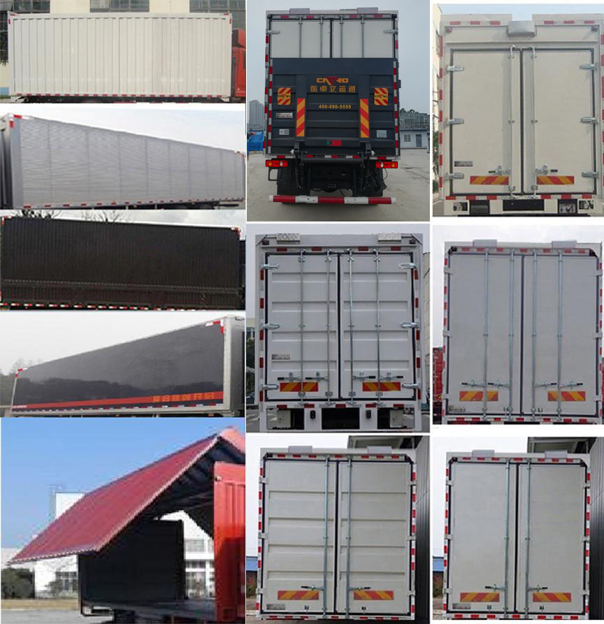 | 备注 | 轴距/前悬/后悬/外廓尺寸长/厢长对应关系:5800/1430/2720/9950/7650,5800/1430/3070/10300/8000,7100/1430/3470/12000/9700,7150/1430/3420/12000/9700。 货厢水平承载面系固点数量与厢长的对应关系:16/7650,16/8000,20/9700。 选装前雾灯,选装侧窗玻璃,选装驾驶室前围面罩,驾驶室顶部选装导流罩;厢体选装平板和瓦楞板结构;选装起重尾板,尾板质量为550kg,尾板收起状态时的水平长度为295mm;选装起重尾板时仅选用截面尺寸为Φ121的后防护;选装起重尾板时,安装起重尾板警示标识。 | ||||||||||