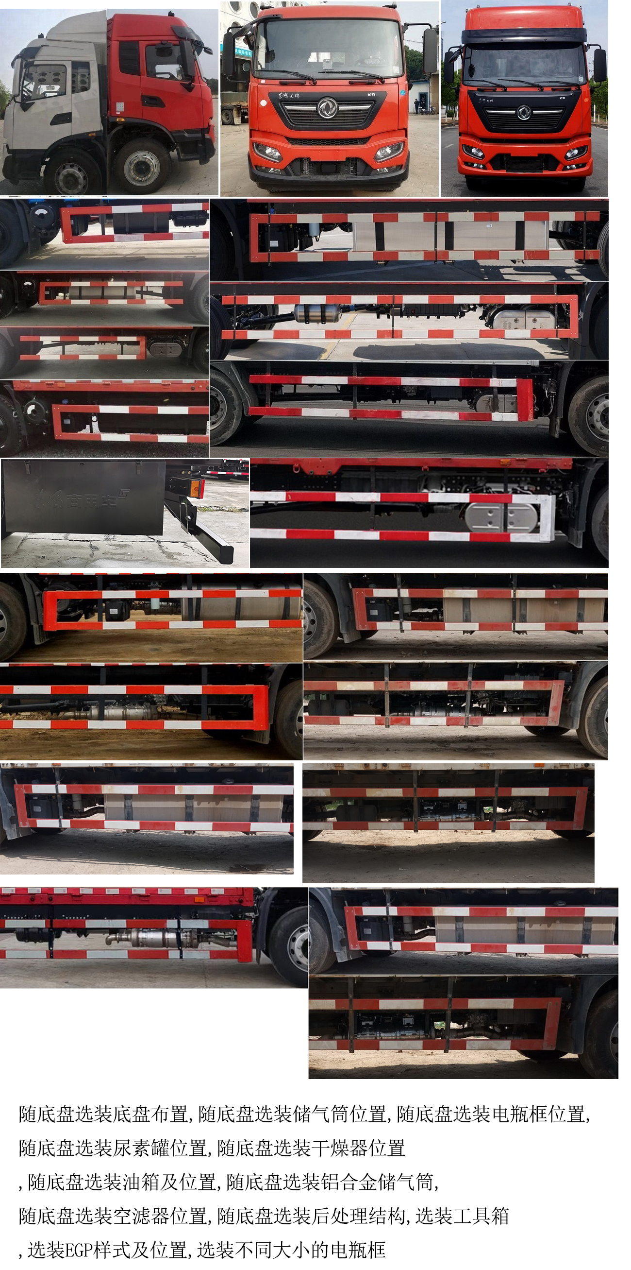 | 备注 | 随底盘选装驾驶室,随底盘选装底盘布置,选装侧窗装饰板,选装前雾灯,选装导流罩,选装遮阳罩,选装厢体结构,选装车门裙板,选装无车门裙板,选装与车身颜色相同的前保险杠,选装侧转向灯,选装前下视镜,选装驾驶室前部灯具,选装高顶驾驶室带导流罩,选装驻车空调,随底盘选装储气筒位置,随底盘选装电瓶框位置,随底盘选装尿素罐位置,随底盘选装干燥器位置,随底盘选装油箱及位置,随底盘选装铝合金储气筒,随底盘选装空滤器位置,随底盘选装后处理结构,选装工具箱,选装驾驶室顶部“东风商用车”企业标识,选装驾驶室“星耀版”企业标识,选装EGP样式及位置,选装不同大小的电瓶框;选装驾驶室拉花装饰。 轮胎爆胎应急安全装置型号/轮胎爆胎应急安全装置生产企业:3110010-KG8V1/扬州市奥特瑞汽车电子科技有限公司, 湖北源久汽车零部件有限公司;3110010-TF850/扬州市奥特瑞汽车电子科技有限公司,十堰市华迪汽车零部件有限公司。 轮胎规格型号/轮辋规格:10.00R20 18PR/7.5-20,11R22.518PR/22.5×8.25,275/80R22.5 18PR/22.5×8.25。 最高车速105对应的配置:1.发动机B6.2NS6B230、B6.2NS6B260,D6.7NS6B290;2.轮胎275/80R22.5 18PR、11R22.5 18PR;3.盘式制动器、制动器衬片更换报警装置、爆胎应急、胎压监测、ESC、AEBS、FCW。 最高车速89km/h、10.00R20 18P轮胎不对应AEBS、FCW、ESC、制动器衬片更换报警装置、盘式制动器、驾驶室爆胎应急安全装置、轮胎气压监测系统。 非独立式空气悬架仅对应最高车速89km/h。 | ||||||||||