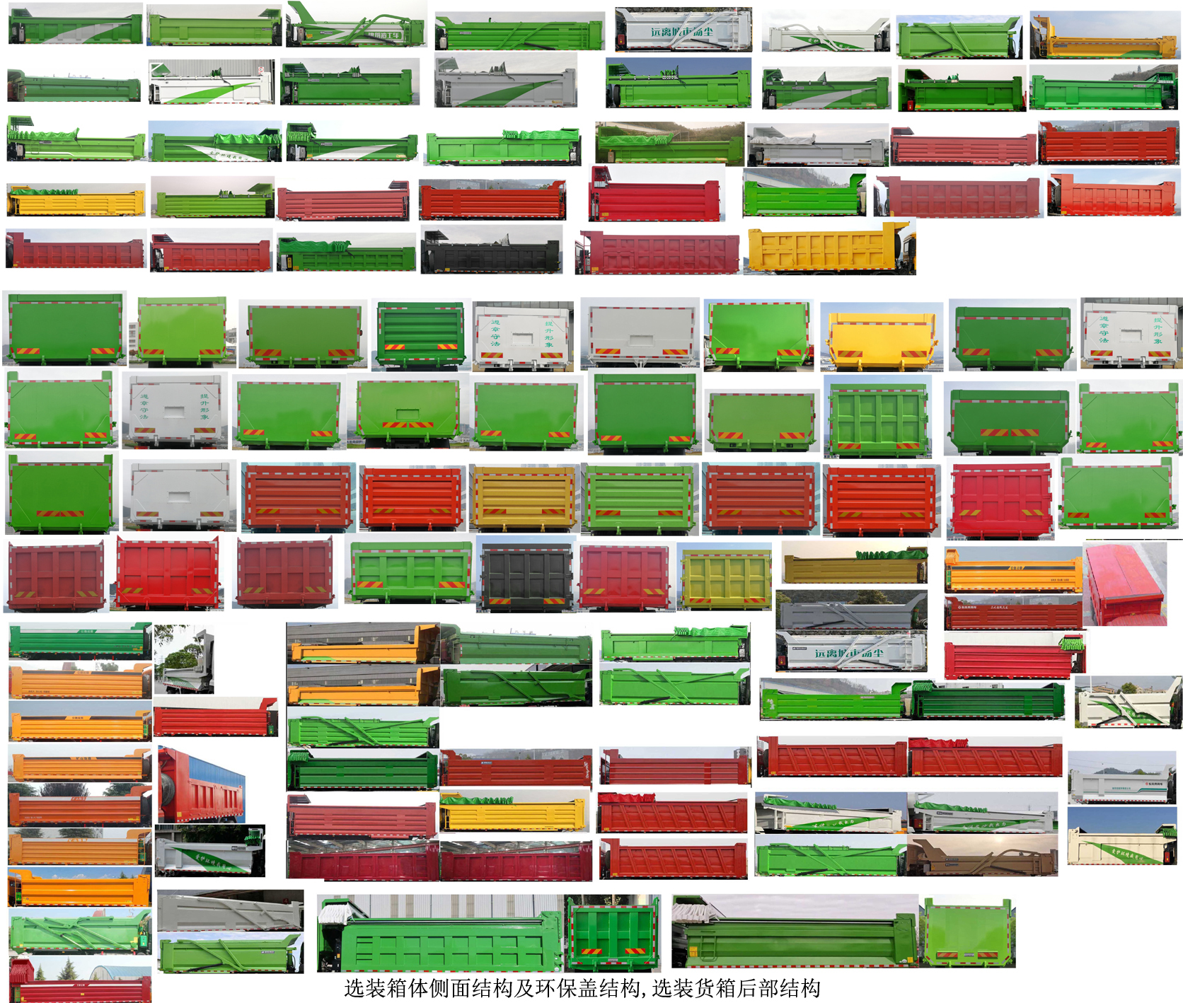 | 备注 | 随底盘选装驾驶室、底盘布置,选装驾驶室拉花。选装防护涂装颜色。选装箱体侧面结构、货箱后部结构及环保盖结构,选装引气道外观,选装驾驶室后围挡板,尿素罐挡板,选装后处理隔热板,选装铝合金储气筒。选装翻转支架结构。 | ||||||||||