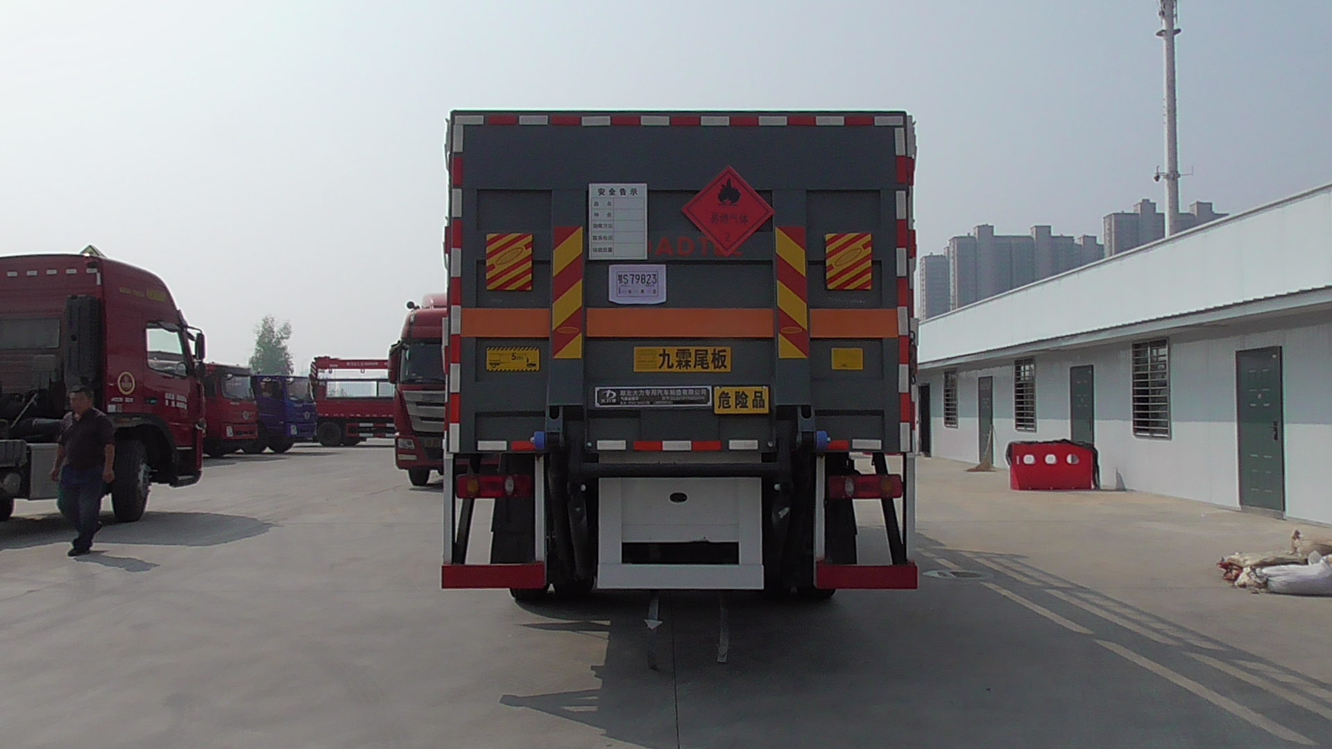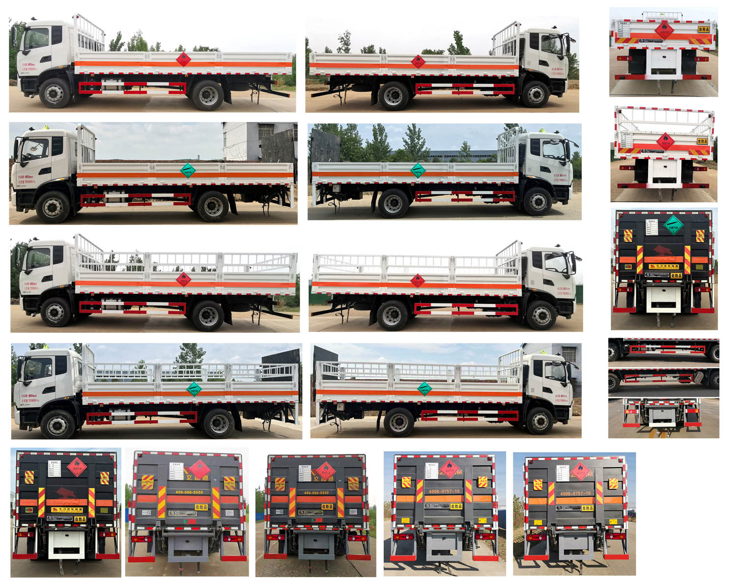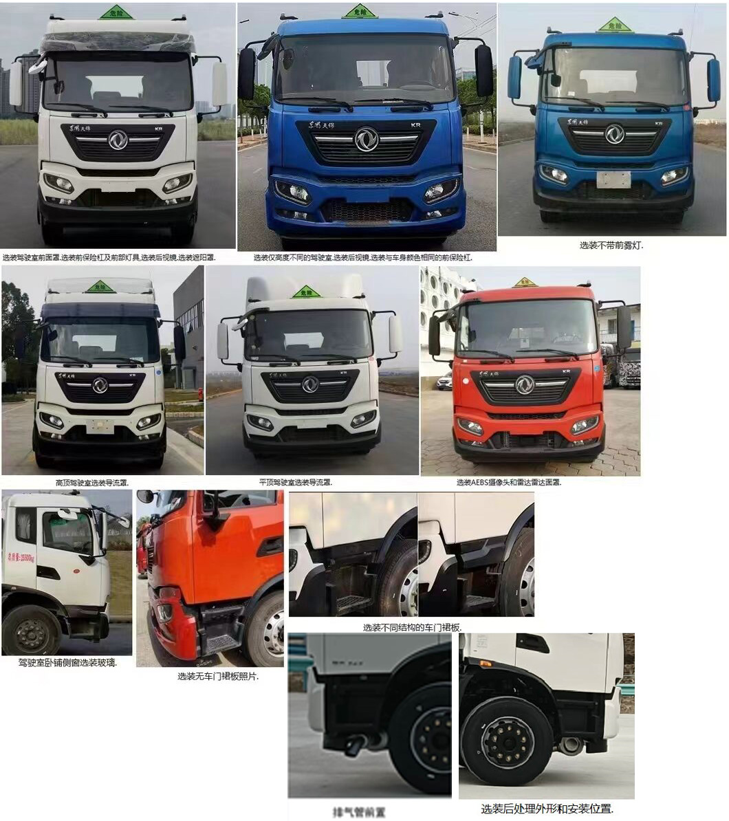 | 备注 | 该车为危险品运输车.装有限速装置,限速80km/h.液压尾板收起水平长度:300mm,尾板质量为550kg.选挂2.1类易燃气体警示牌或2.2类非易燃无毒气体警示牌,选装无栅栏样式,选装瓦楞板样式.选装电瓶、储气筒不同排列位置.随底盘选装处理器不同排列位置,随底盘选装驾驶室。 | ||||||||||