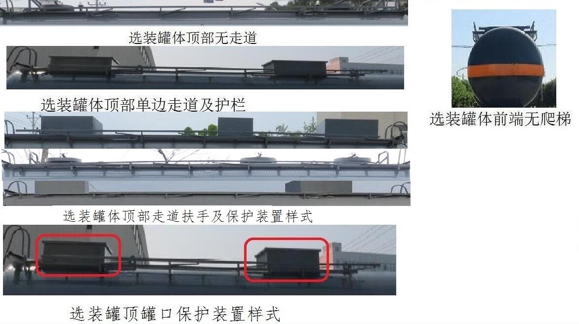 备注 | 选装罐体前部无爬梯,选装罐体顶部走道,护栏及罐口保护装置样式,特定运输介质为:“氧化性危险货物”,危险化学品类项号:5.1. | ||||||||||