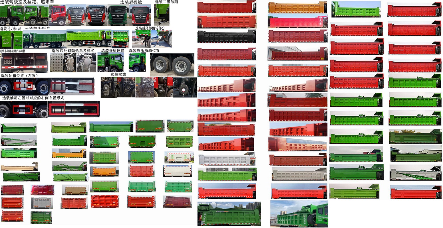 | 备注 | 1.随底盘选装尿素罐、电瓶框布置位置及遮阳罩,选装新风格驾驶室拉花和装饰件;选装轮辋风格,选装货厢样式及环保盖和篷布,选装消声器及空滤器位置; 2.自卸方式为后卸式; 3.外形长度对应关系(总长=前悬+轴距+后悬)为: 9700=1410+1850+3250+1350+1840, 9400=1410+1850+3250+1350+1540; 4.该车型可选装ETC车载装置. | ||||||||||