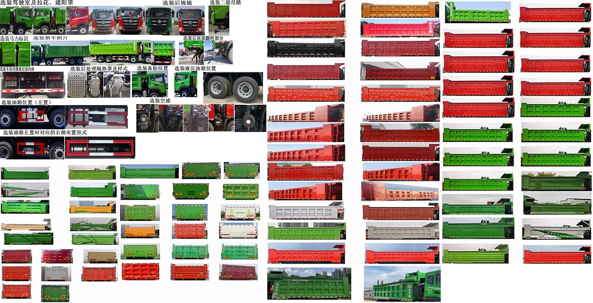 | 备注 | 1.随底盘选装尿素罐、电瓶框布置位置及遮阳罩,选装新风格驾驶室拉花和装饰件;选装货厢样式及环保盖和篷布,选装消声器及空滤器位置,选装空滤样式,选装液压油箱位置,选装轮辋风格; 2.车厢倾卸方式:后卸; 3.外形长度对应关系(总长=前悬+轴距+后悬)为: 9900=1410+1850+3600+1350+1690, 10100=1410+1850+3600+1350+1890, 10300=1410+1850+3600+1350+2090, 10500=1410+1850+3800+1350+2090, 10700=1410+1850+3800+1350+2290; 4.该车型可选装ETC车载装置; | ||||||||||