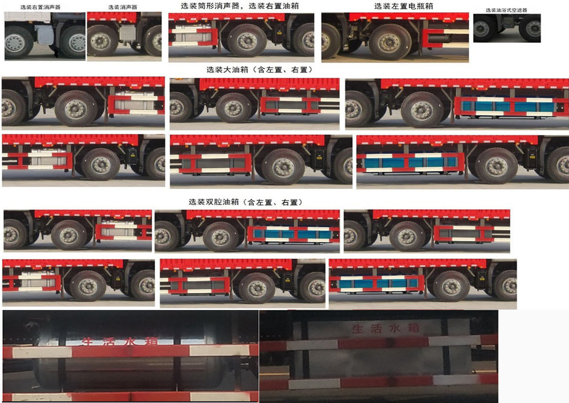 | 备注 | 随底盘选装同系列驾驶室、导流罩及顶置空调;选装货厢及开门形式;选装生活水箱,选装油箱、尿素罐、电瓶框布置位置,选装油箱材质;选装分体式后视镜、不带遮阳罩、导流罩;选装升降尾板,尾板收起时水平长度295mm,尾板质量550kg;选装起重尾板时,安装起重尾板警示标识。该车型可选装ETC车载装置。 | ||||||||||