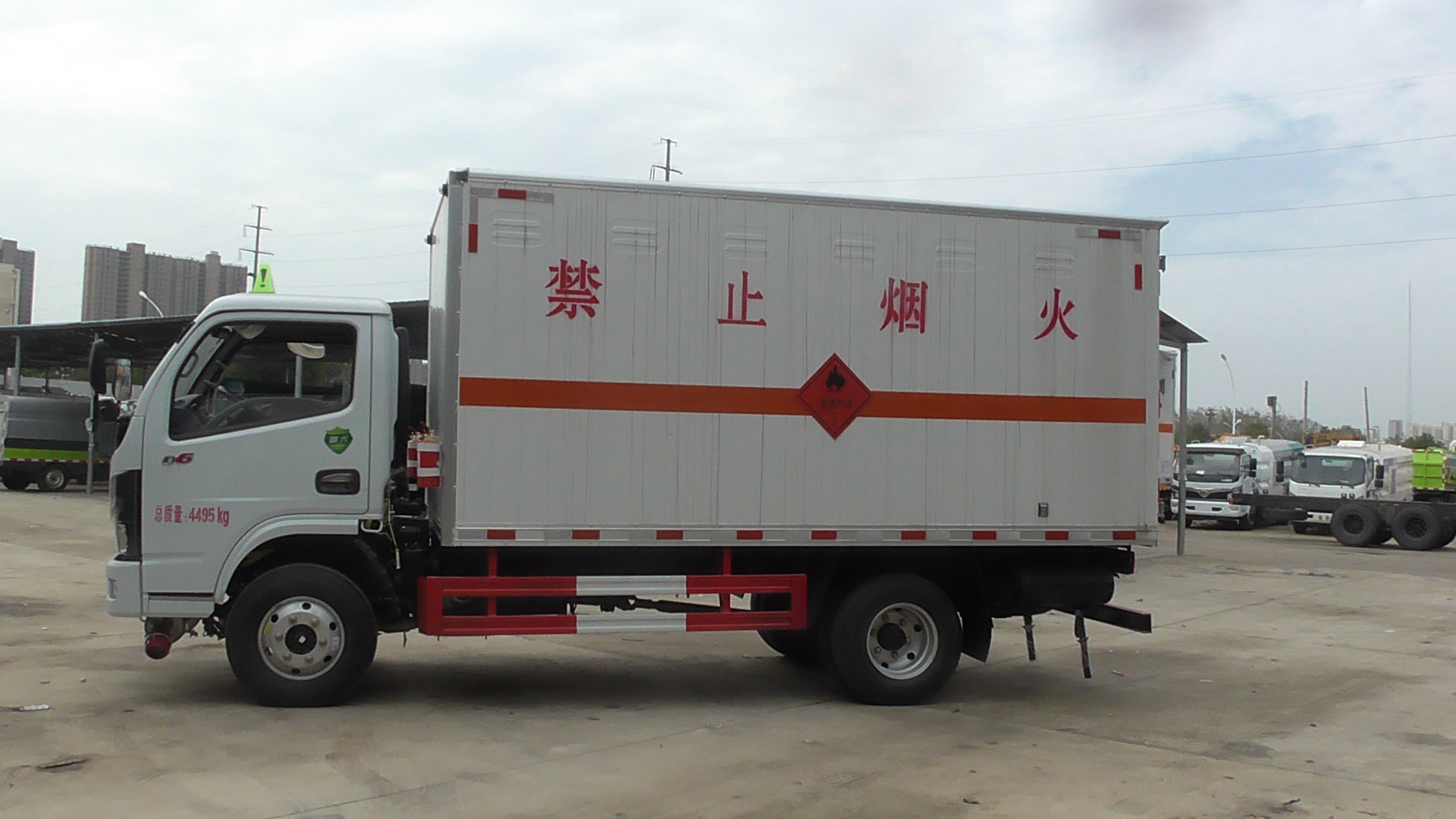 | 备注 | 选装右侧箱体不开门,选装侧门型式及位置,选装不开侧门时宽度2100mm。该车适用于运输危险品。厢体顶部封闭,不可开启.装配限速装置,限速80km/h.该车运输具有独立容器包装的易燃气体:液化石油气,压缩天然气,乙炔,乙烷,丙烷,丁烷,异丁烷,丁烯,甲烷,丙烯,环丁烷,丙二烯,甲乙醚,打火机或打火机加油器(装有易燃气体),氢,运送危险品类项号为2.1;运输具有独立容器(瓶)包装的非易燃无毒气体:液化气体(非易燃,充有氮,二氧化碳或空气),压缩氧(氮,空气,氦,氩,氖),二氧化碳,类项号2.2. | ||||||||||