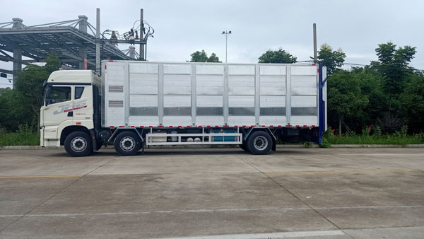 | 备注 | 随底盘选装驾驶室,后部装有升降机和液压尾板,液压尾板收起状态的水平长度为280mm,液压尾板重量550kg;车厢顶部可选装升降板或通道翻门用于装卸畜禽及清洗厢体时使用,中间有隔栏,侧面有滑窗及风扇,前部工作间选装加热器,制冷空调机组等,选装后部不带升降机和液压尾板结构.选装箱体后门结构;选装两层、三层、四层仓栅结构,选装箱体前部带单开门结构和封板结构 | ||||||||||