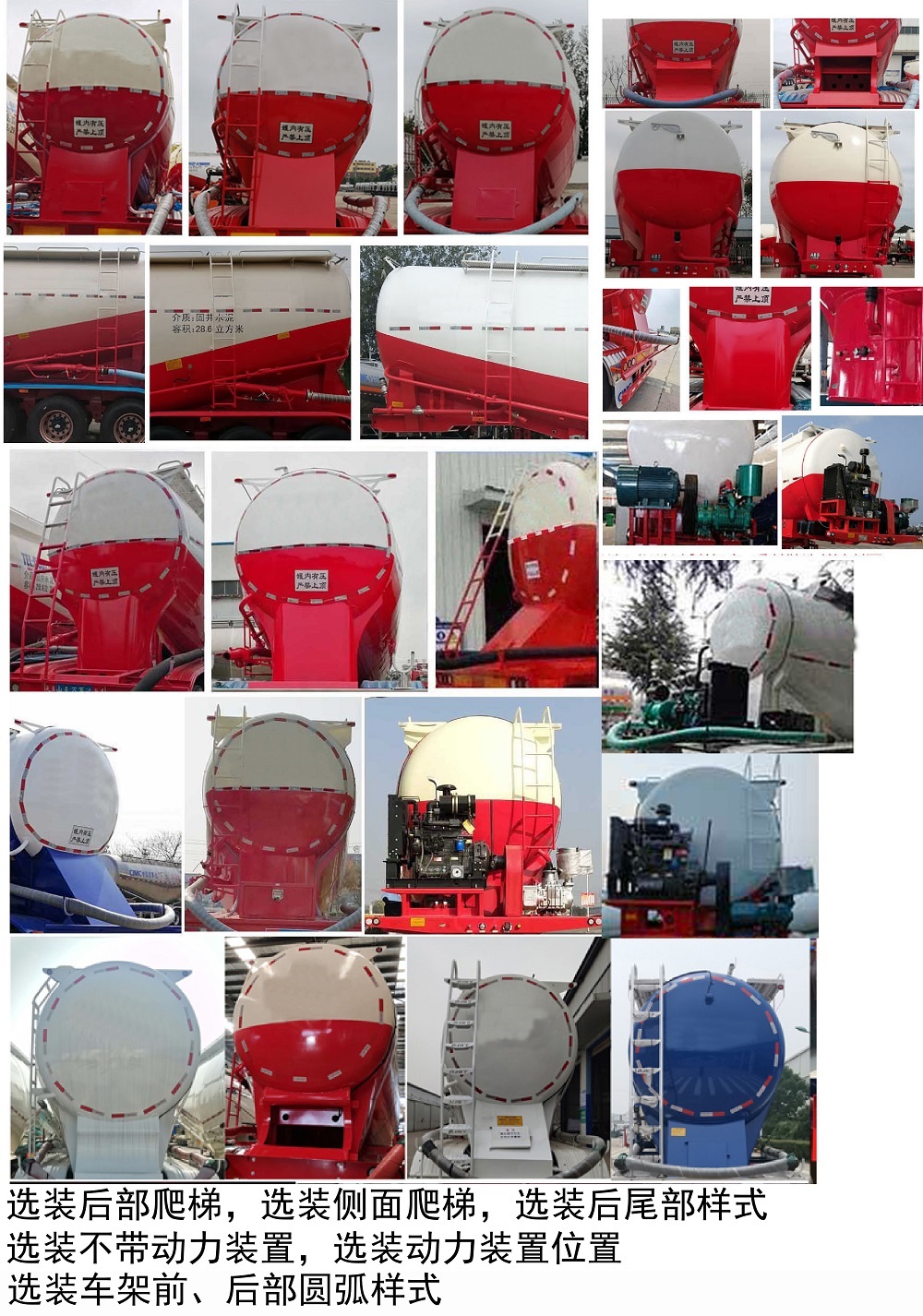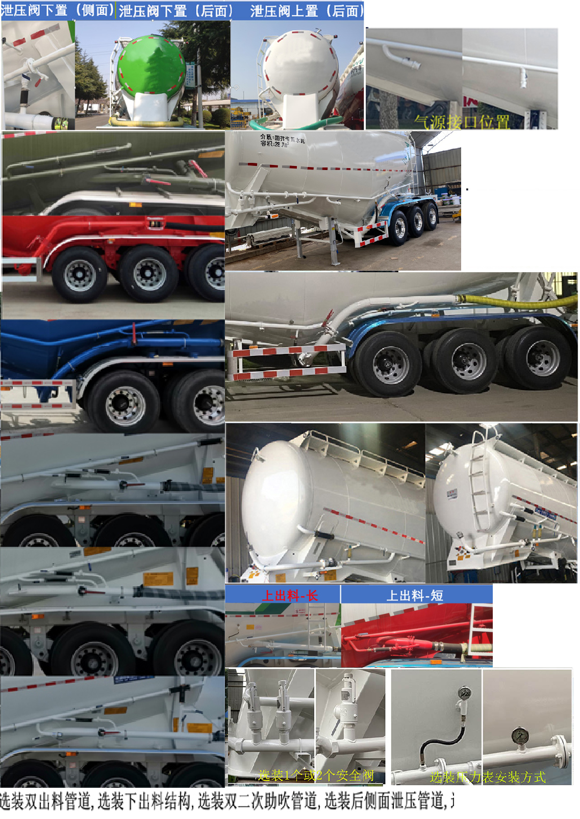 备注 | 1. 选装描述:选装车辆前部不加装机组;选装机组样式;选装走台样式;选装爬梯安装位置(前部/侧面/后部)及个数(一个/两个/三个);选装单、双进气管道,选装放气阀位置;选装后部大梁堵板样式;选装单双安全阀;选装双出料管道,选装下出料结构,选装双二次助吹管道,选装牵引销后大梁结构;选装大梁后部异形孔非异形孔结构;选装罐体图案样式; 2.车长/牵引销到车辆最前端距离/轴距/后悬(mm)/牵引销中心轴线到半挂车最后端水平距离/半挂车前回转半径 对应关系分别为:9400=1210/4800+1310+1310/770/8190/1758; 9400=1430/4380+1310+1310/970/7970/1916; 9250=1280/4580+1310+1310/770/7970/1807; 9250=1280/4380+1310+1310/970/7970/1807; 8750= 560/4800+1310+1310/770/8190/1393; 8750= 780/4380+1310+1310/970/7970/1495; 8550= 580/4580+1310+1310/770/7970/1401; 8550= 580/4380+1310+1310/970/7970/1401 3. 整备质量与额定载质量对应关系为:6800/33200,6200/33800; | ||||||||||