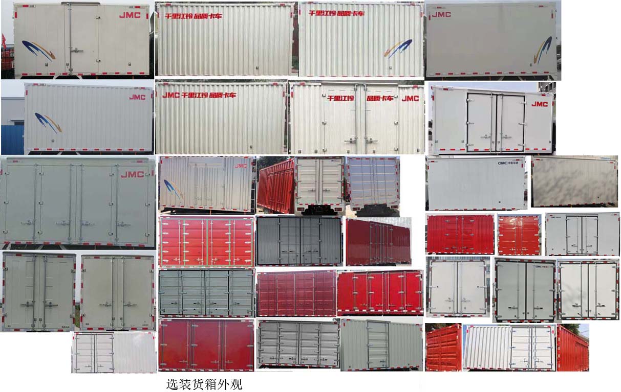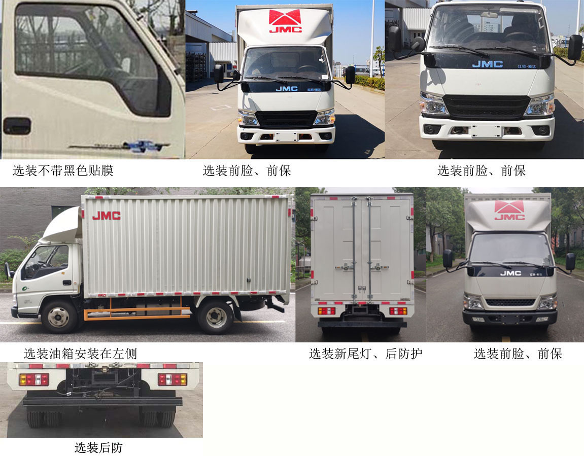 | 备注 | 1、整车尺寸/货箱尺寸对应关系:整车外宽1880,1970与货箱内宽1800,1890一一对应;前悬1075,1095与后悬1560,1540一一对应; 2、发动机JX4D30A6H只与主减速器速比5.375一起装配。 3、气压制动鼓前/后:MN1-1102-D/GN3-1102-F/制动蹄前/后:3501JL080A-101/3501JL100A-101/制动衬片前/后:3501QZ33-105/3501QFS01A-105仅匹配前轮距1465、1480。 4、选装气压制动系统及储气筒压力测试连接器等附件,气压制动时不带真空助力。 5、门框黑色贴膜可选择取消。选装前脸前保外观,选装油箱安装在左侧,选装尾灯外观,选装后防护,选装货箱外观。 | ||||||||||