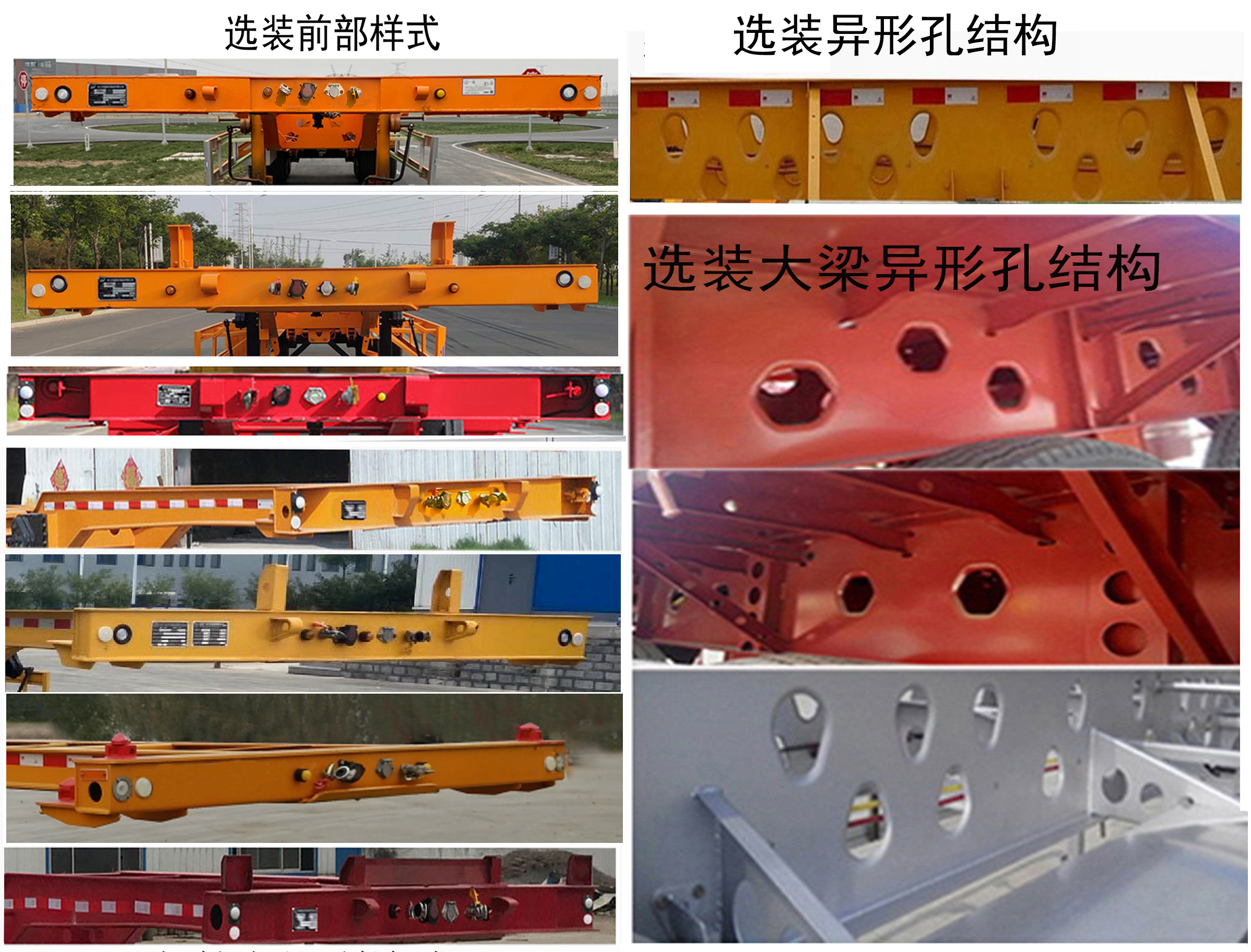 | 备注 | 该车用于运输45英尺集装箱,集装箱规格为1EE;选装车辆前部样式;选装车架大梁异形孔样式;选装铝合金侧防护装置样式 | ||||||||||