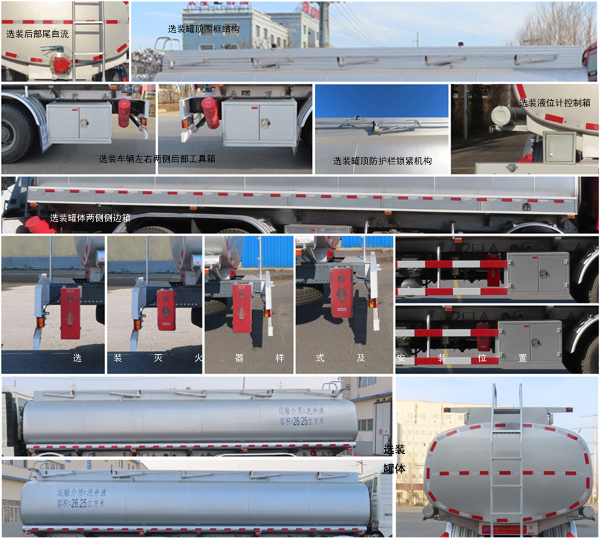 | 备注 | 选装:后部尾自流、罐顶围框结构、车辆左右两侧后部工具箱、罐顶防护栏锁紧机构、液位计控制箱、罐体两侧侧边箱、灭火器样式及安装位置、罐体尺寸.随底盘选装驾驶室 | ||||||||||