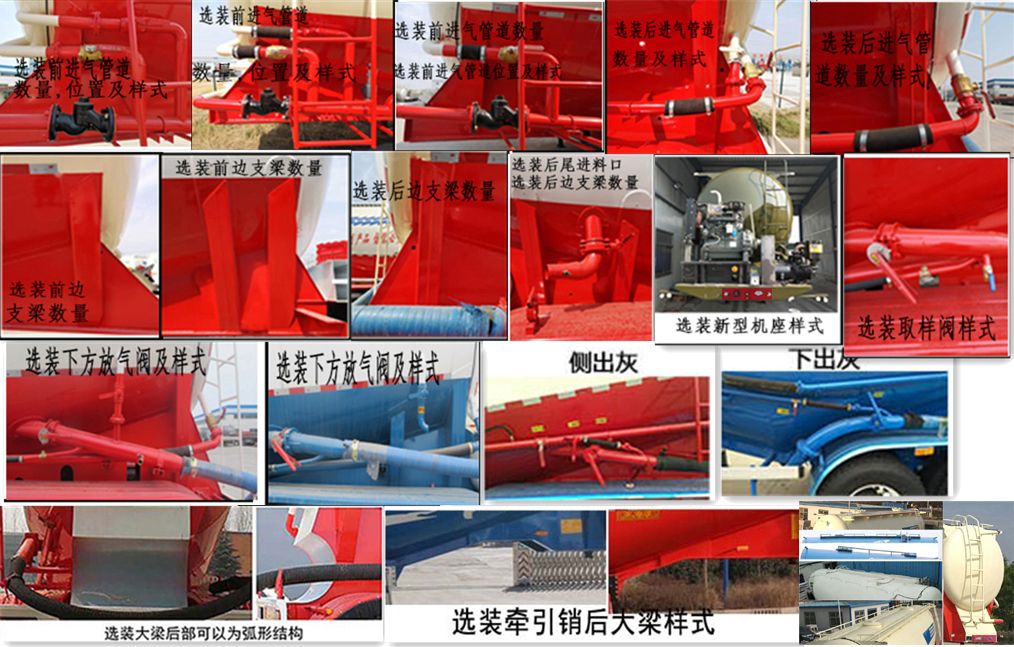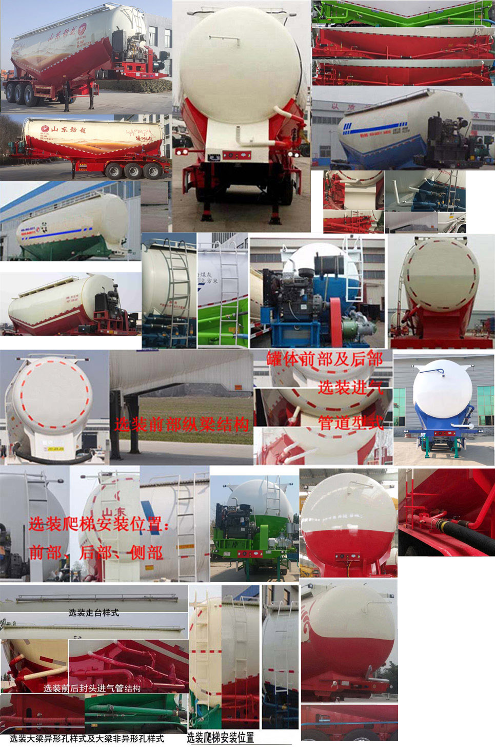 备注 | 1.该车顶部封闭不可开槽,后部不可开启;罐体有效容积:45立方米;罐体长度9600mm,罐体宽度2550mm,罐体高度3220mm,前后封头直径为1900mm;运输介质:粉煤灰( 密度为740千克/立方米).选装大梁异形孔非异形孔样式,选装轮罩样式及走台样式;选装前部及后部结构;选装爬梯安装位置和数量;选装外观结构;选装罐体前部及后部进气管道型式:一根管、两根管、内部管道;选装车身颜色;选装下方放气阀及样式和前/后边支梁数量;选装大梁后部可为弧形结构及牵引销后大梁样式;选装新型机座样式和侧,下出灰样式;; 2.车长/牵引销至车辆最前端的距离/轴距/后悬/牵引销中心轴线到半挂车最后端水平距离/半挂车前回转半径的对应关系为(mm):10350/1560/5170+1310+1310/1000/8790/2014,9700/910/5170+1310+1310/1000/8790/1566; 3.整备质量/额定载质量的对应关系为(kg):7700/32300,7010/32990; | ||||||||||