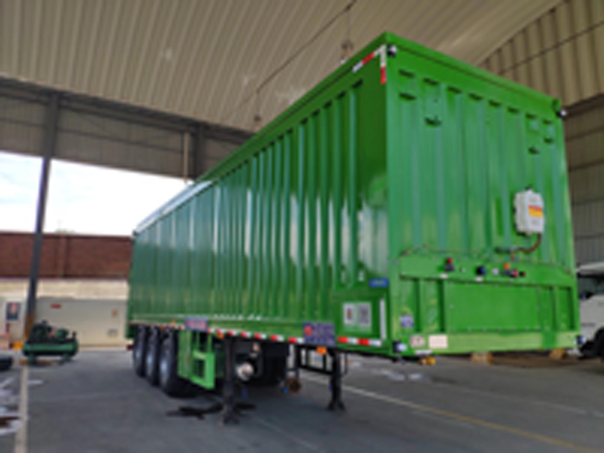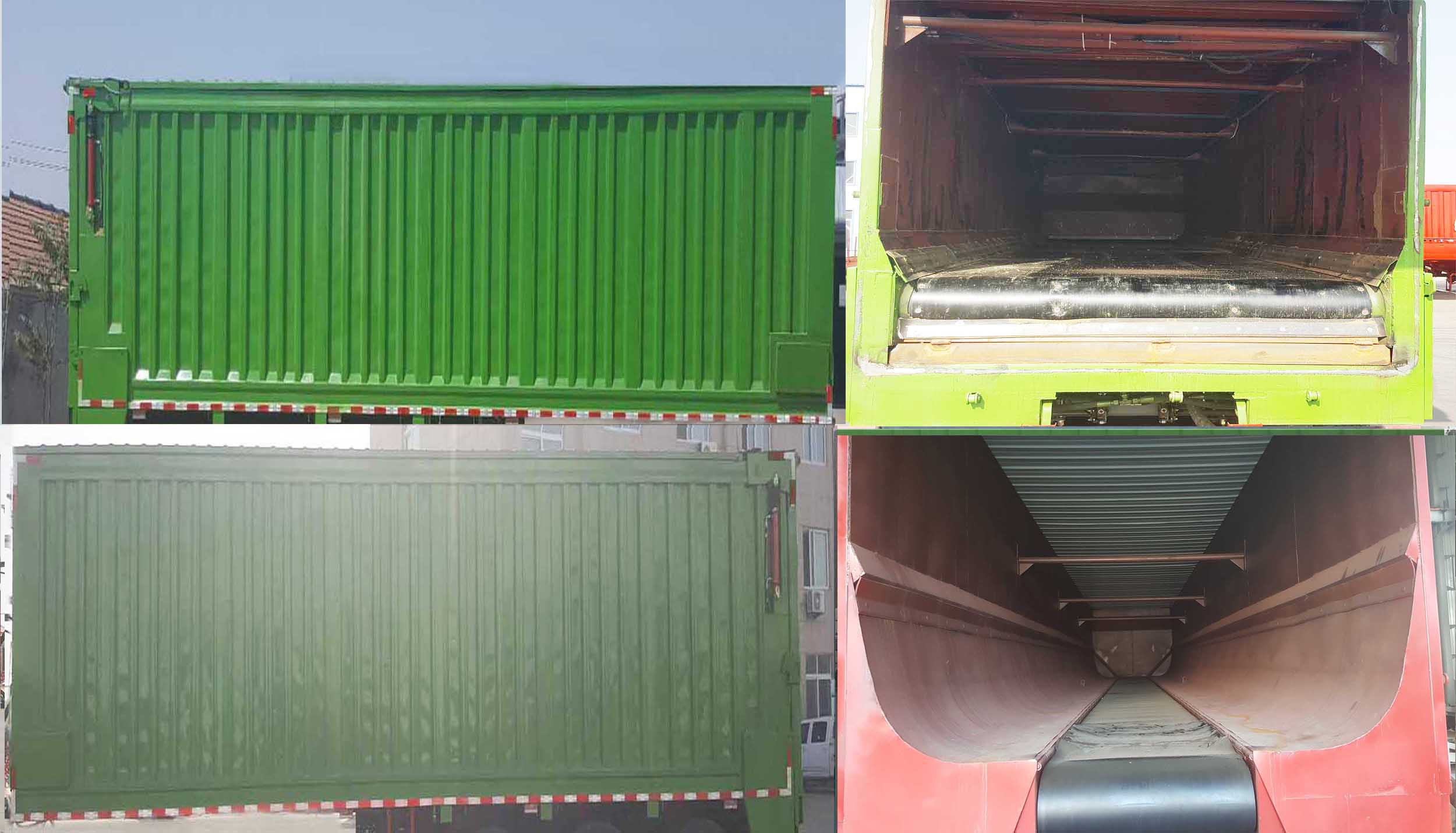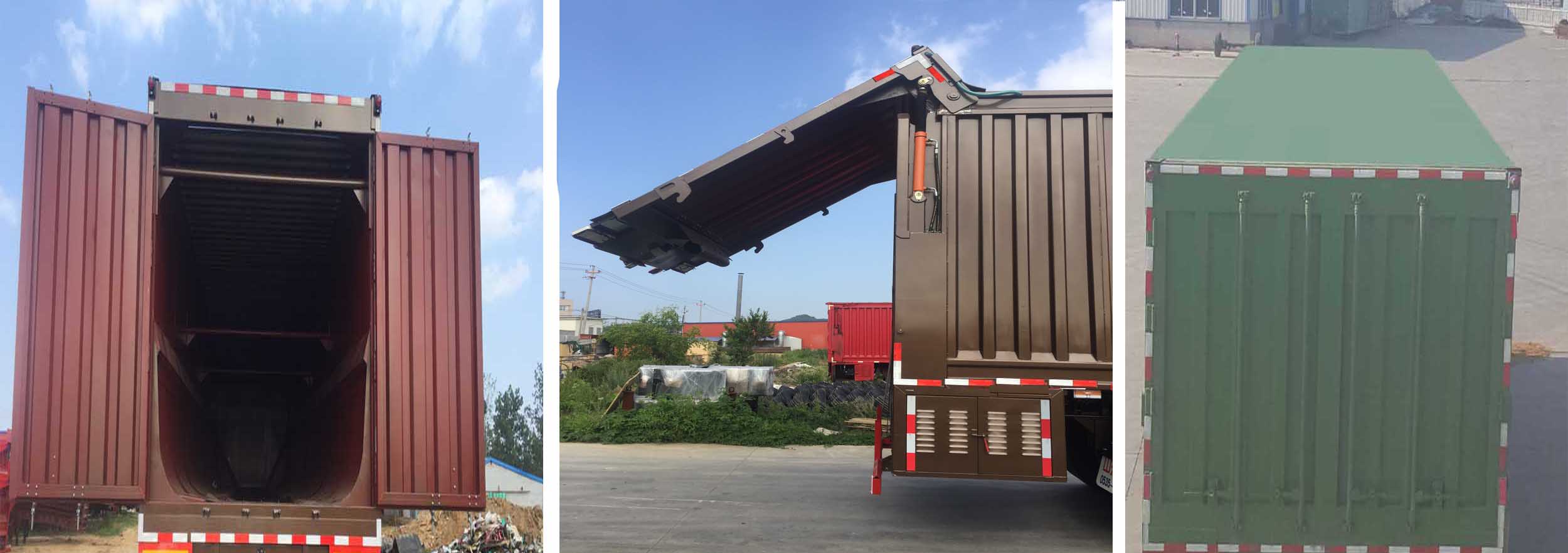 | 备注 | 1:该车顶部封闭,不可开启。卸货方式为传送带传送,车厢底部中间为橡胶传送带结构,用于清理垃圾。该车选装挡泥板罩;选装后门开启方式;选装内部结构;选装箱体外观;选装顶部外观。2:外廓尺寸长度与牵引销中心轴线到半挂车最后端水平距离的对应关系(mm)为:11500/10100;11000/9600;10500/9100。 | ||||||||||