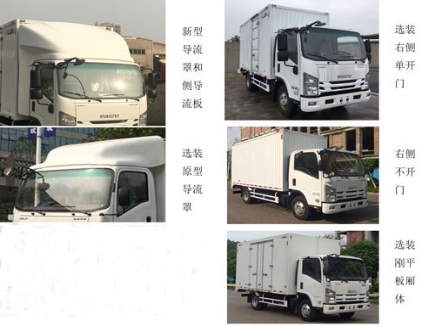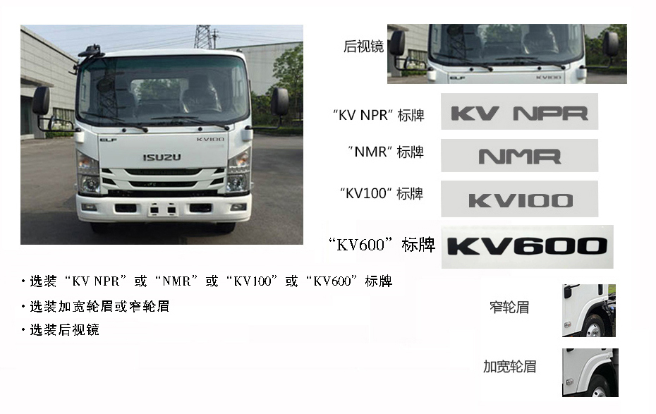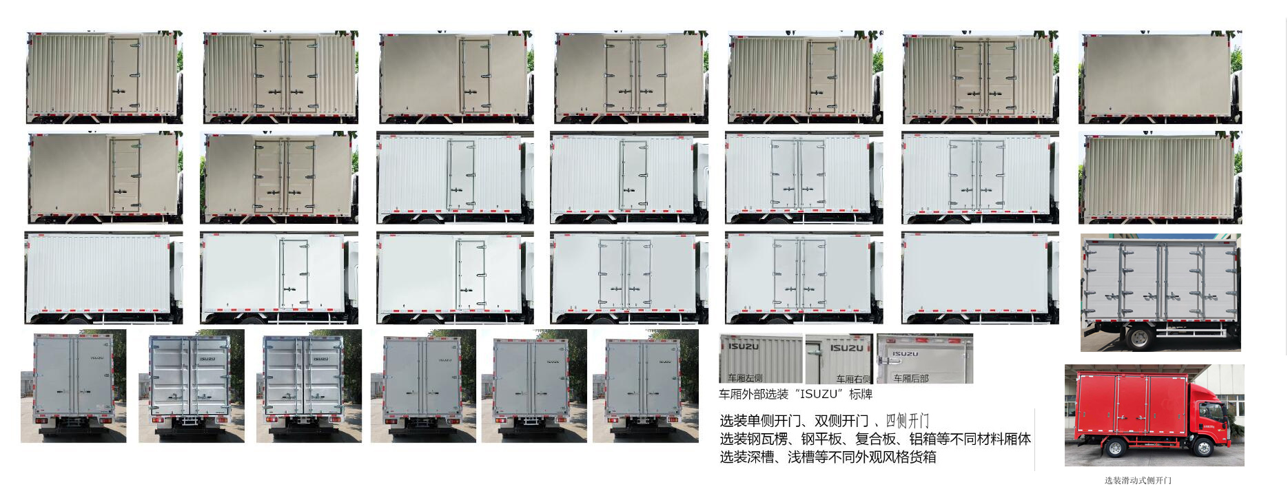 | 备注 | 1、该车选装发动机,装4KH1CN6LB型发动机时,净功率为87kW,对应变速器型号:MSB-5SM,速比:6.142,对应整车尺寸为:5995x2360x3330(mm);装4KH1CN6HB型发动机时,净功率为96kW,对应变速器型号:MYY-6S,速比:5.857,对应整车尺寸:5995x2210x3210(mm); 2、侧防护材料:钢板 Q235,连接方式:用螺栓连接在车厢横梁上;后防护材料:钢板SAPH440,板厚2.0mm,连接方式:后防护支架以螺栓连接在车架纵梁尾端,后防护断面尺寸:139.4×50mm,离地高度:462mm; 3、该车选装后视镜,轮眉,标牌; 4、该车选装右侧单开门、右侧不开门;选装钢平板厢体; 5、该车顶部封闭,不可开启; 6、前后轮距:1690/1655(mm),对应整车尺寸为:5995x2360x3330(mm),货箱栏板内尺寸为:4130x2300x2300(mm);前后轮距:1640/1655(mm),对应整车尺寸:5995x2210x3210(mm),货箱栏板内尺寸为:4130x2150x2150(mm); 7、该车车厢外部选装“ISUZU”标牌; 8、该车选装单侧开门、双侧开门、四侧开门,选装钢瓦楞、钢平板、复合板、铝箱等不同材料厢体,选装深槽、浅槽等不同外观风格货箱。 | ||||||||||