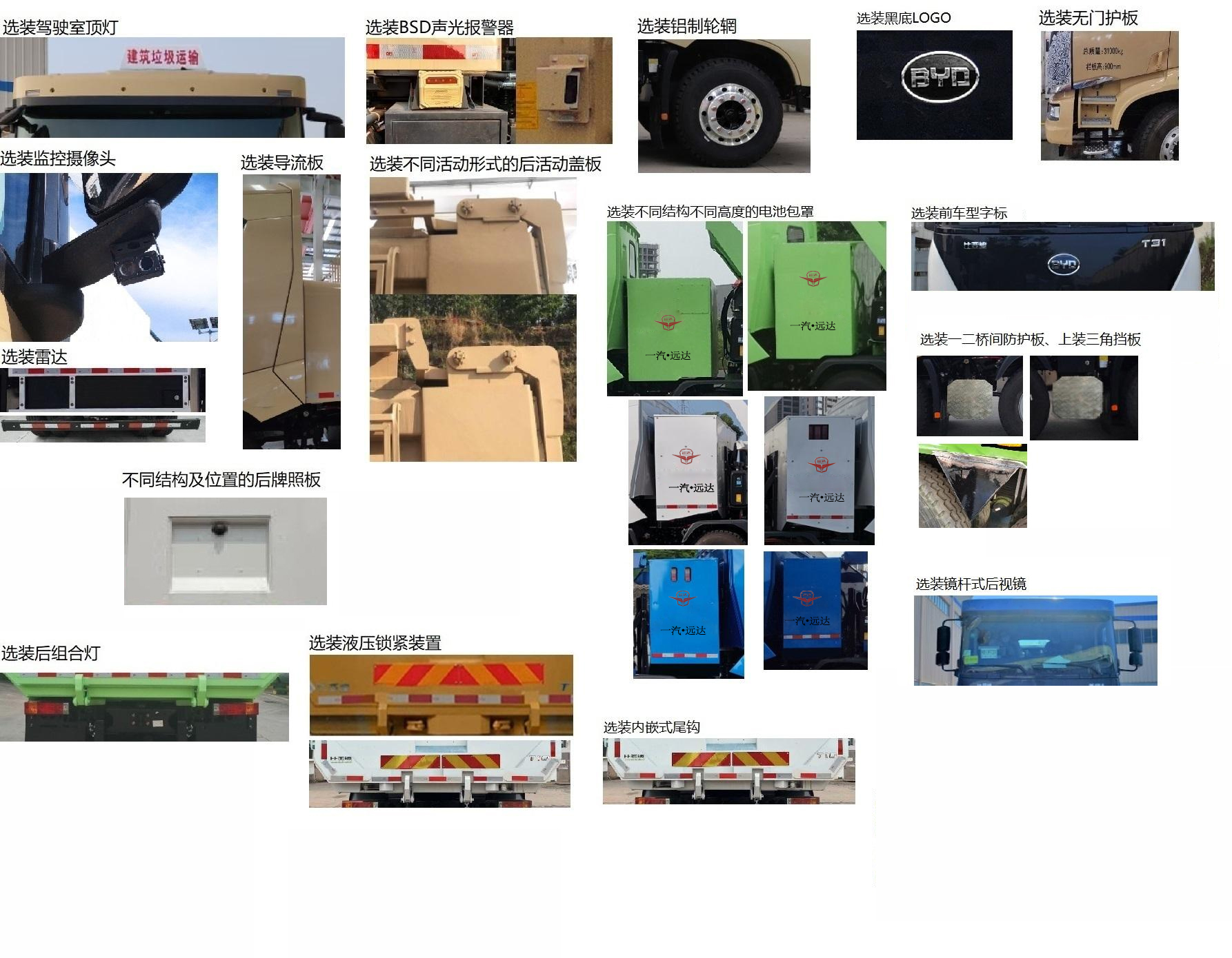 | 备注 | 选装监控摄像头,雷达,驾驶室顶灯,BSD声光报警器,不同结构活动形式的后活动盖板,后组合灯,液压锁紧装置,内嵌式尾钩,导流板,铝制轮辋,黑底Logo,车型字标,不同结构不同高度的电池包罩,不同结构及位置的后牌照板,一二桥间防护板,上装三角挡板,镜杆式后视镜,无门护板,不同结构不同高度的货箱及顶盖,该车可选装车载ETC装置 | ||||||||||