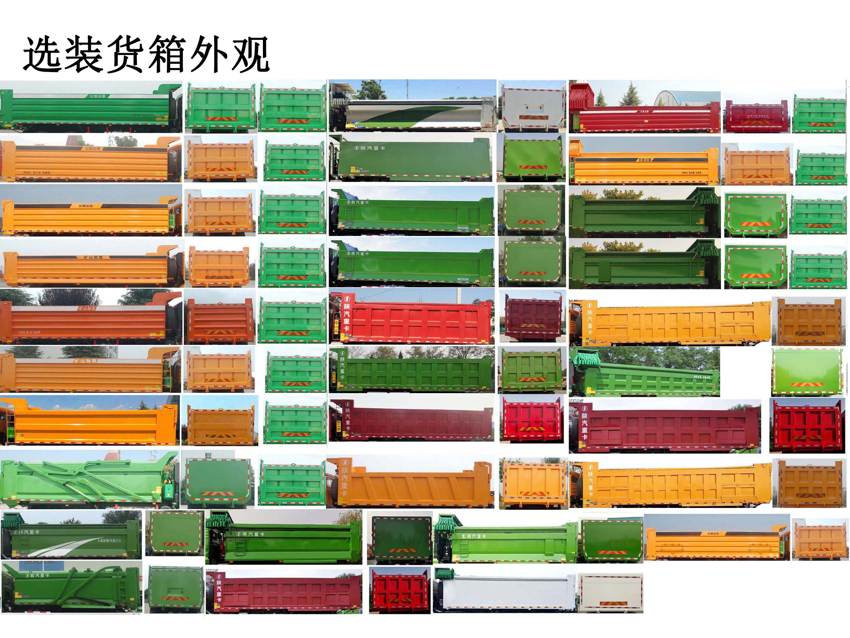 | 备注 | 1、选装同系列驾驶室、货箱及储能装置外观;选装汽车导静电橡胶拖地带。 2、外形尺寸长(mm)/轴距(mm)/后悬(mm)货厢长度(mm)对应关系为:9400/1800+3175+1400/1500/5600,9600/1800+3375+1400/1500/5600,9800/1800+3575+1400/1500/5800或6000,10250/1800+3775+1400/1750/6500,10250/1800+3975+1400/1550/6500,10400/1800+3975+1400/1700/6500。 3、防抱制动装置系统型号为EBS 5时,仅可装12.00R20 18PR轮胎。 | ||||||||||
