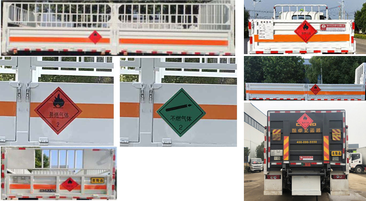 | 备注 | 主要用于运输具有独立容器(瓶)包装的货物,危险货物类项号:2.1,2.2.该车运输的介质为2.1项易燃气体时,车辆采用“易燃气体”标识牌,运输的介质为2.2项非易燃无毒气体时,车辆采用“不燃气体”标识牌。选装栏板样式,选装无栅栏样式。 | ||||||||||