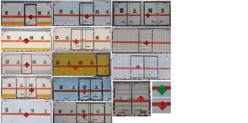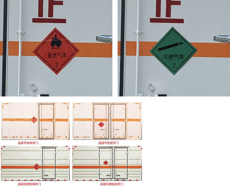 | 备注 | 1、该车用于危险品运输,厢体顶部封闭,不可开启.该车运输具有独立容器包装的气体介质,运输介质类项号为2.1,2.2.运输易燃气体时挂2.1类警示牌,运输非易燃无毒气体时挂2.2类警示牌。2、随底盘选装驾驶室,选装平板单开门和双开门,选装瓦楞板单开门和双开门,选装侧门型式及位置,选装不开侧门,厢体侧面板;选装开百叶窗,选装瓦楞板结构. | ||||||||||