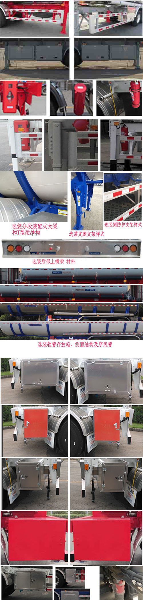 | 备注 | 1.选装爬梯可装在罐体前部或后部或前后都装.选装罐体顶部护肩或集液槽及顶护栏.选装握手盒结构布置及穿线管。 2.选装灭火器安装位置及样式,选装分段装配式大梁和T型梁结构、支腿支架样式、侧防护支架样式,选装后部上横梁材料,选装软管存放箱、侧面结构及穿线管,选装侧面尾部工具箱(或操作箱),选装侧防护工具箱样式. 3.选装挡泥板,侧面后端工具箱(或操作箱). 4.选装尾部标志板的数量。 | ||||||||||