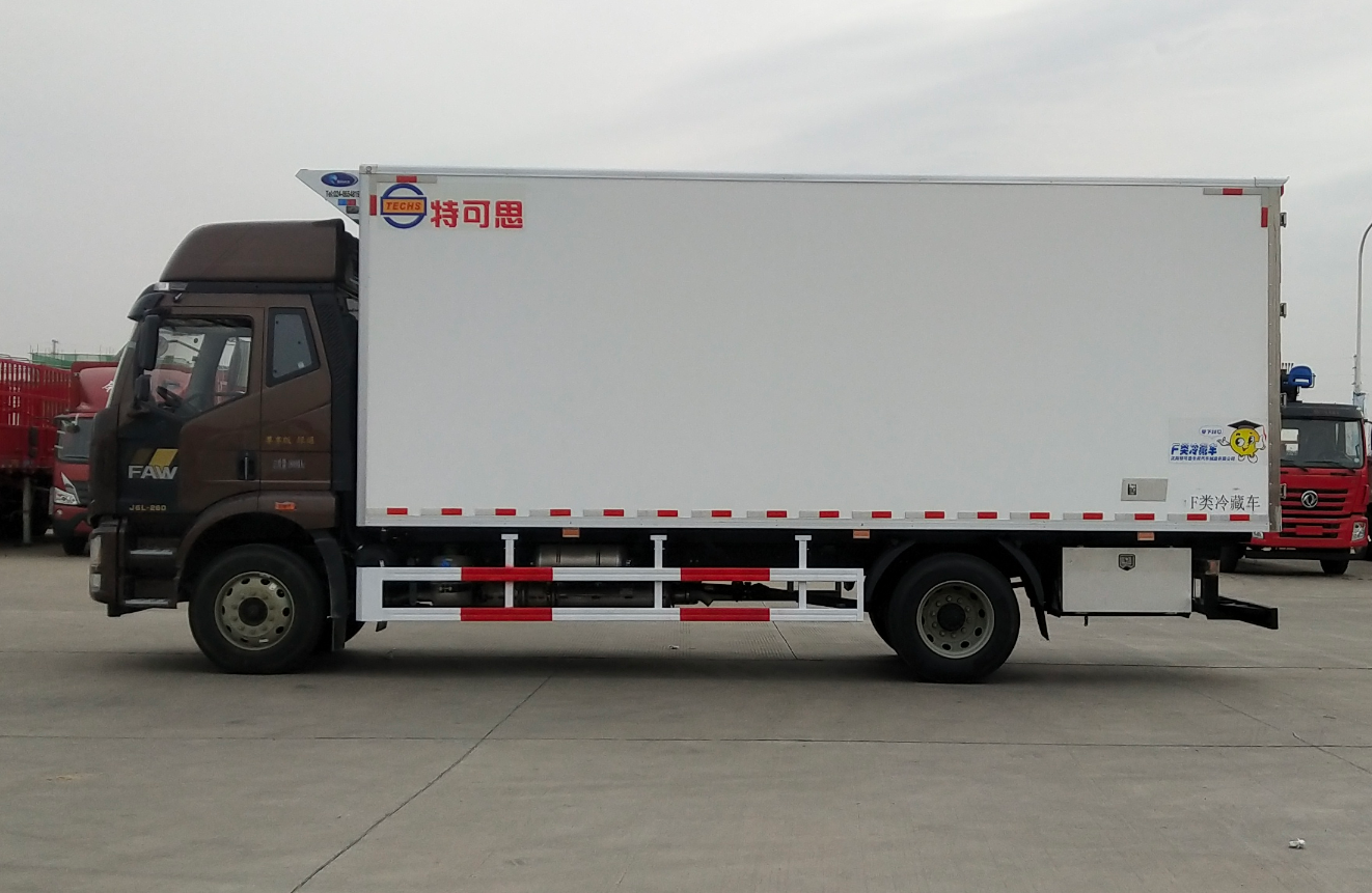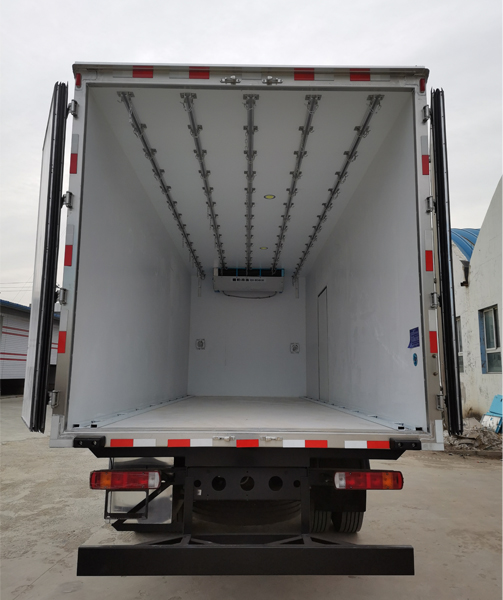 | 备注 | 1.随底盘选装驾驶室;选装同等功率制冷机组,制冷机组外观形状可不同; 厢体两侧可选装侧开门及位置或不带侧门;选装顶板上安装肉挂钩,底盘上安装铝轨通风道,选装铝底板;选装后门锁杠样式; 2.整备质量7600kg,对应额定载质量10270kg(驾驶室准乘2人)或10205kg(驾驶室准乘3人);整备质量7905kg,对应额定载质量9965kg(驾驶室准乘2人)或9900kg(驾驶室准乘3人) 3.货箱门数量及尺寸:侧门1扇,尺寸1750mm×870mm;后门2扇,尺寸2462mm×1183mm;选装侧门2扇,尺寸1750mm×870mm;后门2扇,尺寸2462mm×1183mm;冷藏车车厢保温材料厚度为85mm. | ||||||||||