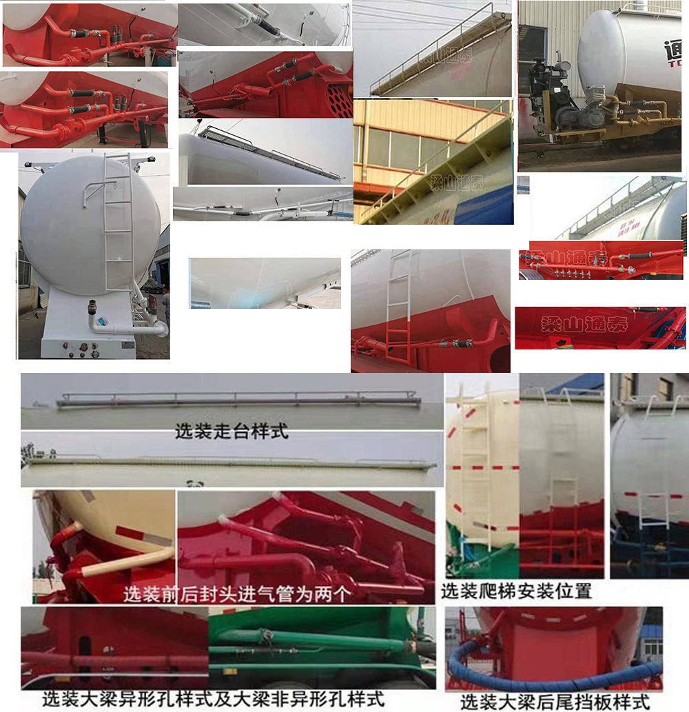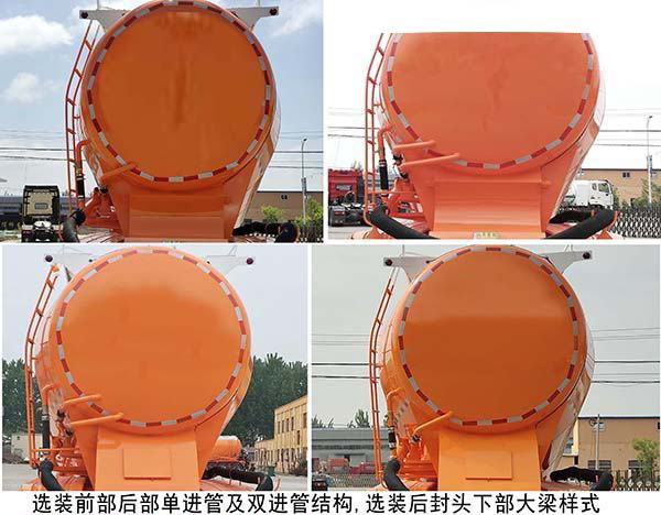 | 备注 | 1,顶部封闭不可开槽,后部不可开启,容积:29立方米,运输介质:固井专用水泥,罐体外形尺寸为:长7500mm;前后封头直径2010mm,最大截面处高度3200mm,最大截面处宽度2550mm,选装罐体外形尺寸为:长7750mm;前后封头直径2010mm,最大截面处高度3200mm,最大截面处宽度2550mm,选装罐体外形尺寸为:长8050mm;前后封头直径2010mm,最大截面处高度3150mm,最大截面处宽度2550mm;整车选装后置机组与不加装机组时,外长为:8650mm,8500mm;整车选装前置机组时,外长为9150mm;选装侧出灰及下出灰结构,选装爬梯位置(前部、后部、侧部)及个数(1个、2个或3个),选装大梁部位为异形孔及无异形孔结构,选装气压表数量(1个、2个或3个),选装前后封头进气管为一个及两个,选装走台样式,选装大梁后部弧形结构,选装前部后部单进管及双进管结构,选装后封头下部大梁样式,选装后尾样式,2;车长/轴距/后悬/半挂牵引销到车辆最前端距离/半挂车前回转半径/牵引销中心轴线到半挂车辆长度最后端的水平距离(mm)的参数对应关系为:9150/4750+1310+1310/850/930/1578/8220,9150/4500+1310+1310/750/1280/1806/7870,8650/4750+1310+1310/830/450/1352/8200,8500/4500+1310+1310/750/630/1422/7870,3;整备质量(kg)/额定载质量(kg)的对应关系:6600/33400,6300/33700,6050/33950; | ||||||||||