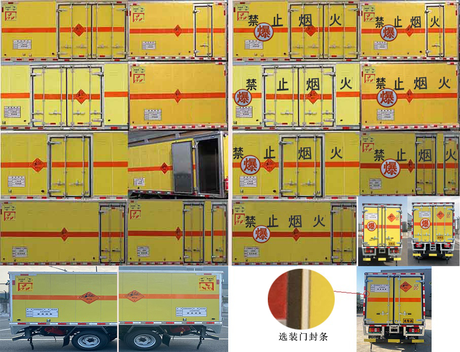 | 备注 | 选装不同形式的侧开门或无侧门或侧面双开门,选装前隔断。此车选装抗爆容器,抗爆容器型号:ULC-200、ULC-200A、ULC-200C,生产企业:浙江路捷顺汽车制造有限公司。选装抗爆容器时,车厢需加隔断,抗爆容器需安装在隔舱内;不装载抗爆容器,对应整备质量3205kg,额定载质量1160kg。该车安装限速装置,限速80km/h。 | ||||||||||