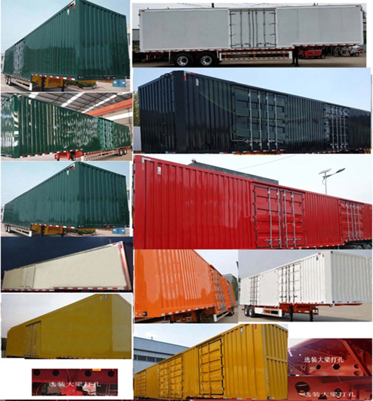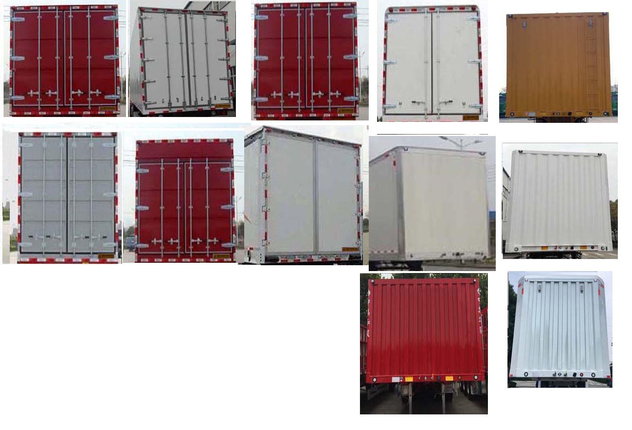 | 备注 | 1、车长/牵引销中心到车辆最前端距离/半挂车前回转半径/轴距/后悬/牵引销中心轴线到半挂车辆长度最后端的水平距离(mm)的对应关系: (1)13750/1750/2040/8290+1310/2400/12000;(2)13750/1750/2040/8050+1310/2640/12000; (3)13000/1000/1620/8050+1310/2640/12000;(4)13000/1000/1620/8290+1310/2400/12000; (5)13000/1000/1601/8050+1310/2640/12000;(6)13000/1000/1601/8290+1310/2400/12000; 2、整备质量(kg)/额定载质量(kg)的对应关系:7250/27750,6900/28100,6600/28400; 3、车厢顶部封闭不可开启,选装侧面样式及后部样式,厢体可以选装瓦楞结构;开门方式可选装一侧开门或两侧开门,开门数量可选装一侧开1个门或一侧开2个门,选装开门锁杆结构,门扇可选装横瓦结构或方格结构;选装大梁异形孔结构 | ||||||||||
