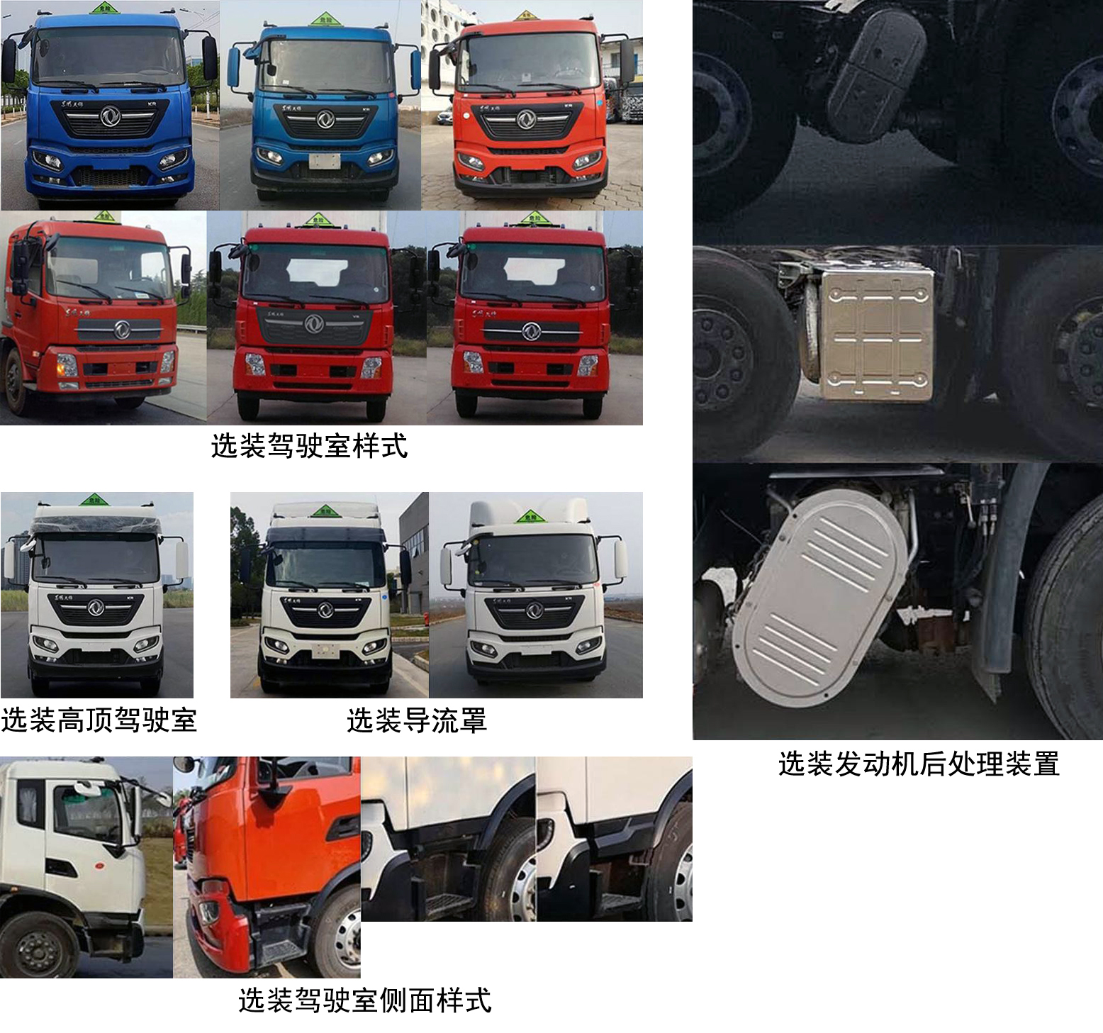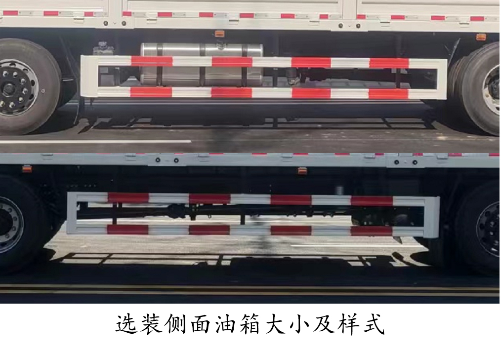 | 备注 | 随底盘选装驾驶室样式、选装高顶驾驶室、选装导流罩、选装驾驶室侧面样式、选装发动机后处理装置;选装货箱箱体结构及样式;选装侧面油箱大小及样式;选装空调造型以及排气管防护罩。外廓尺寸长/轴距/货厢对应关系:11000/1995+5000/8600;10250/1995+4200/8600;10100/1995+4200/7700;12000/1995+5300/9600,9800。轴距在1995+4200、1995+5000的情况下,侧防护采用螺栓连接在车厢底板横梁,轴距在1995+5300的情况下采用螺栓连接在车厢底板。 | ||||||||||