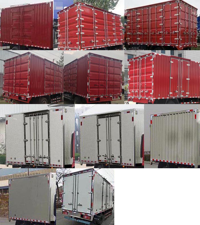 备注 | 该车货厢顶部封闭,不可开启。货厢侧门可封闭,选装双侧开门货厢,选装九开门货厢,厢体采用彩涂板和瓦楞板两种风格。选装前面罩,选装前保险杠,选装前组合灯,选装前雾灯,选装单排驾驶室,选装前字标,选装遮阳罩,选装铝合金轮毂,选装轮罩,选装蓄电池安装位置,选装尿素箱安装位置。选装不同材质货厢(PP蜂窝板、铝蜂窝板、复合板、彩涂钢板、铝合金扣板、铝合金瓦楞板、玻璃钢、高强钢瓦楞板、插接板)。外形尺寸(mm)/前悬(mm)/轴距(mm)/后悬(mm)对应关系:7100/1205/3900/1995;7650/1205/4300/2145。货厢栏板内尺寸(长)4810mm与轴距3900mm与车辆前轴到货箱前壁内侧的距离950mm与整备质量(kg) 4920kg一一对应; 货厢栏板内尺寸(长)5150mm与轴距3900mm与车辆前轴到货箱前壁内侧的距离640mm与整备质量(kg) 4920kg一一对应;货厢栏板内尺寸(长)5300mm与轴距4300mm与车辆前轴到货箱前壁内侧的距离950mm与整备质量(kg) 5020kg一一对应。 | ||||||||||