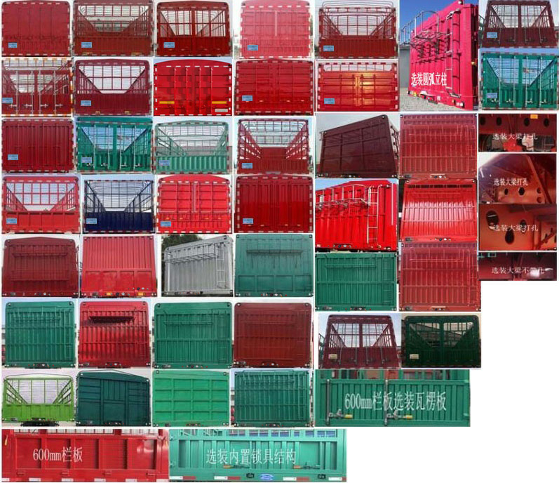 | 备注 | 车厢底板至仓栅顶部高度分别为2600mm,2400mm,2200mm,2000mm,1800mm;选装前档样式,选装后门样式(对开式半封闭后门,对开全封闭样式为横瓦楞,竖瓦楞后门)及侧面花栏结构(二层仓栅,三层仓栅,对开门锁杆,对开门半截锁杆,隐藏锁杆).立柱可选内插,外插样式;选装圆形立柱;车长/车宽/牵引销至车辆最前端的距离/前回转半径/间隙半径/车辆前轴到货箱前壁内侧的距离/轴距/后悬/牵引销中心到车辆最后端的距离尺寸对应关系(mm):13000/2550/1300/1821/2400/1220/6780+1310+1310/2300/11700,13000/2550/1400/1894/2400/1320/6780+1310+1310/2200/11600;13000/2500/1300/1804/2400/1220/6780+1310+1310/2300/11700,13000/2500/1400/1877/2400/1320/6780+1310+1310/2200/11600。 | ||||||||||