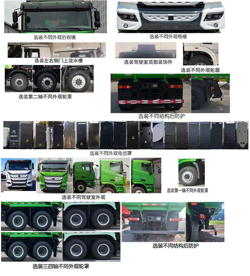 | 备注 | 1、该车装有液压举升机构,自卸方式为后卸;2、可选装不同外观车厢,可选装不同外观环保折叠篷布或环保盖;可选装不同外观后视镜,可选装左右侧门上流水槽,可选装不同外观格栅,可选装驾驶室顶部装饰件,可选装不同外观轮眉,可选装第一轴不同外观轮罩,可选装第二轴不同外观轮罩,可选装不同结构后防护,可选装不同外观电池罩,可选装不同驾驶室外观,可选装三四轴不同外观轮罩;可取消前围英文字母商标、电池罩框架下舱体、车厢两侧摄像头防护罩;2、ABS型号EBS3、ABS-E 4S/4M对应轮距2023、2050、2080对应轮制动规格φ400×150/φ400×150/φ410×220/φ410×220、φ410×160/φ410×160/φ410×220/φ410×220;3、ABS型号ABS 8对应轮距2050、2080对应轮制动规格φ410×160/φ410×160/φ410×220/φ410×220;4、ABS型号CM4XL-4S/4M、CM-EBS对应轮距2023、2050、2080对应轮制动规格φ410×180/φ410×180/φ410×220/φ410×220;5、ABS型号ABS 8、EBS3、ABS-E 4S/4M对应轮距2050、2080对应轮制动规格φ410×180/φ410×180/φ410×220/φ410×220. | ||||||||||