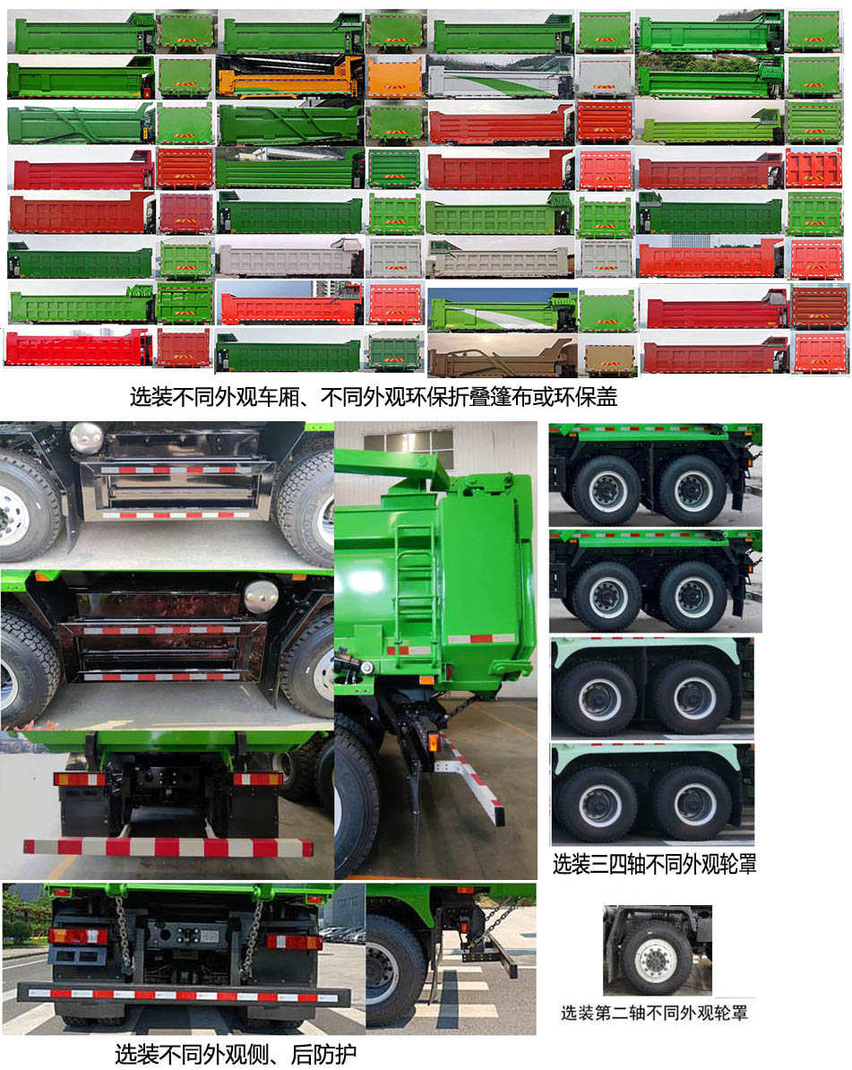 | 备注 | 1、该车装有液压举升机构,自卸方式为后卸;2、可选装不同外观车厢,可选装不同外观环保折叠篷布或环保盖;可选装不同外观后视镜,可选装左右侧门上流水槽,可选装不同外观后组合灯,可选装不同外观格栅,可选装驾驶室顶部装饰件,可选装不同外观轮眉,可选装不同驾驶室外观,可选装不同外观电池罩,可选装第一轴不同外观轮罩,可选装第二轴不同外观轮罩,可选装不同外观侧、后防护,可选装三四轴不同外观轮罩;可取消前围英文字母商标,可取消车厢两侧摄像头防护罩;3、整车长度(mm)/轴距(mm)/后悬(mm)对应关系: 9530/3050/1680,9650/3050/1800,9730/3050/1880;4、ABS型号EBS3,ABS 8,ABS-E 4S/4M对应制动器规格φ410×180/φ410×180/φ410×220/φ410×220对应轮胎规格11.00R20 18PR,12.00R20 18PR,12R22.5 18PR,11.00R20 16PR,12.00R20 16PR,12R22.5 16PR;5、ABS型号EBS3,EBS 5,ABS 8对应制动器规格φ410×160/φ410×160/φ410×220/φ410×220对应轮胎规格11.00R20 18PR,12.00R20 18PR,12R22.5 18PR,11.00R20 16PR,12.00R20 16PR,12R22.5 16PR;6、ABS型号ABS-E 4S/4M对应制动器规格φ410×160/φ410×160/φ410×220/φ410×220对应轮胎规格11.00R20 18PR,12.00R20 18PR,12R22.5 18PR,11.00R20 16PR,12.00R20 16PR,12R22.5 16PR. | ||||||||||