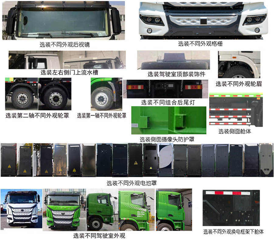 | 备注 | 可选装不同外观车厢,可选装不同外观环保折叠篷布或环保盖;可选装不同外观后视镜,可选装左右侧门上流水槽,可选装不同外观格栅,可选装驾驶室顶部装饰件,可选装不同外观轮眉,可选装不同组合后尾灯,可选装第一轴不同外观轮罩,可选装第二轴不同外观轮罩,可选装侧面摄像头防护罩,可选装侧面舱体,可选装不同外观电池罩,可选装不同驾驶室外观,可选装不同外观换电框架下舱体;可取消前围英文字母商标,可取消电池罩框架下舱体。 | ||||||||||