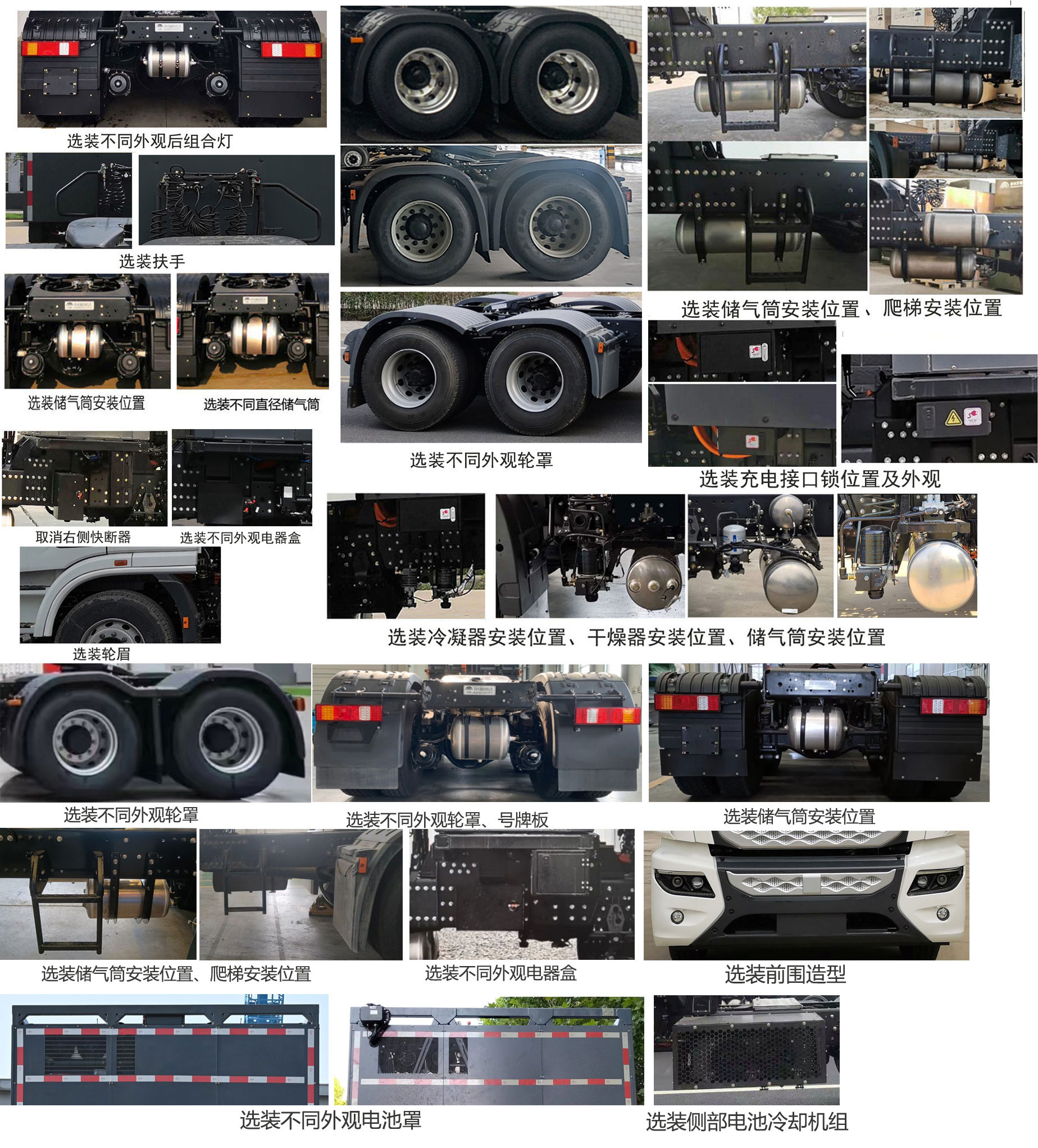 | 备注 | 1.可选装高顶驾驶室、前围造型、导流罩、驾驶室造型、后视镜、踏步、不同外观遮阳罩、不同外观前雾灯、360环视系统、储气筒安装位置、爬梯安装位置、扶手、不同直径储气筒、冷凝器安装位置、干燥器安装位置、充电接口锁位置及外观、不同外观轮罩、不同外观后组合灯、轮眉、不同外观电器盒、不同外观电池罩、号牌板、侧部电池冷却机组,可取消右侧快断器;2.整备质量(kg)/准拖挂车总质量(kg)/鞍座最大承载质量(kg)对应关系:12300/36570/12570,12800/36070/12070,13400/35470/11470;3.轴距/制动规格对应关系为:3825+1350对应φ410×160/φ410×220/φ410×220,3800+1400对应φ410×180/φ410×220/φ410×220;4.防抱制动装置(ABS)系统控制器型号/电子稳定性控制系统(ESC)型号对应关系为:ABS-E 4S/4M对应446 065,CM4XL-4S/4M对应CM-ESC;5.电子稳定性控制系统(ESC)型号/电子稳定控制系统(ESC)控制器型号对应关系为:446 065对应ABS-E 4S/4M,CM-ESC对应CM4XL-4S/4M;6.整车高度说明:3560对应高顶驾驶室(无导流罩)状态,3600对应电池罩顶部高于驾驶室(无导流罩)状态,3995对应高顶驾驶室带导流罩状态。 | ||||||||||