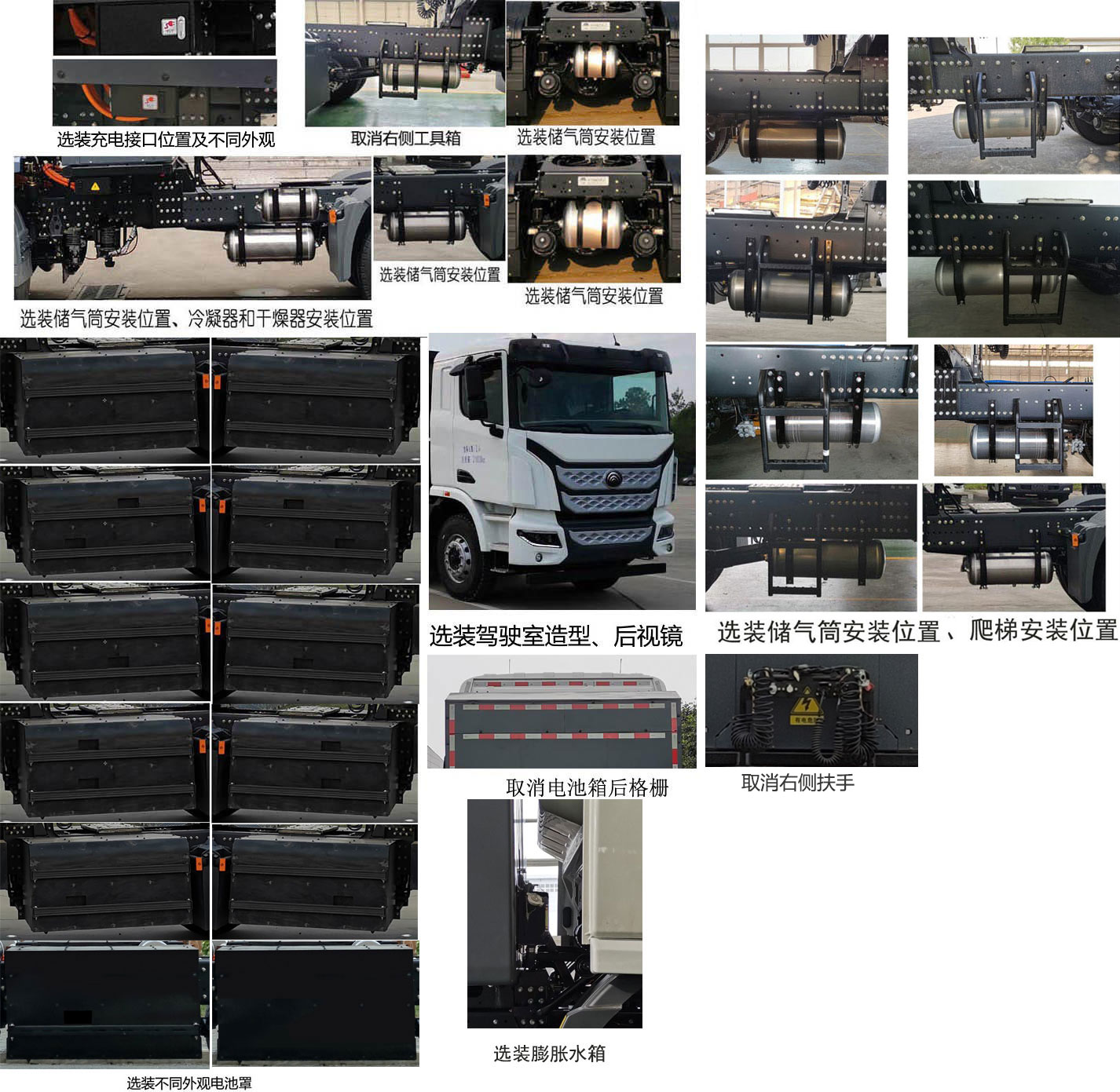 | 备注 | 1.可选装平顶驾驶室、前围造型、踏步、不同外观遮阳罩、顶部导流罩、左侧扶手、握手阀、充电接口位置及不同外观、选装储气筒安装位置、冷凝器和干燥器安装位置、驾驶室造型、后视镜、不同外观电池罩、侧部导流罩、不同外观前雾灯、膨胀水箱、360环视系统、不同外观轮罩、不同外观后组合灯、爬梯安装位置、号牌板、轮眉、不同外观电器盒;可取消右侧扶手、右侧工具箱、电池箱后格栅、取消导流罩;2.整备质量(kg)/准拖挂车总质量(kg)/鞍座最大承载质量(kg)对应关系10800/38070/14070,11250/37620/13620,11500/37370/13370。 | ||||||||||