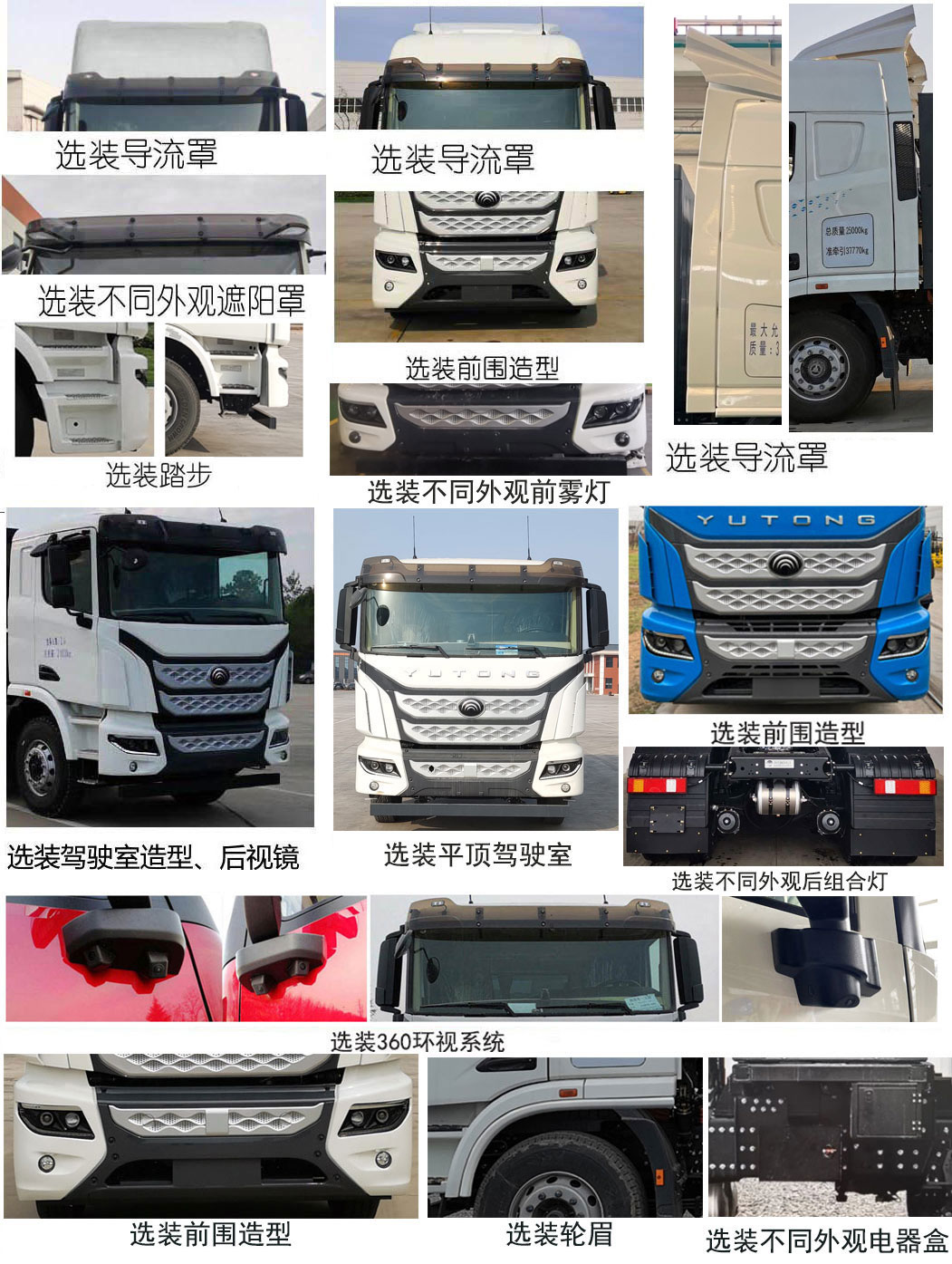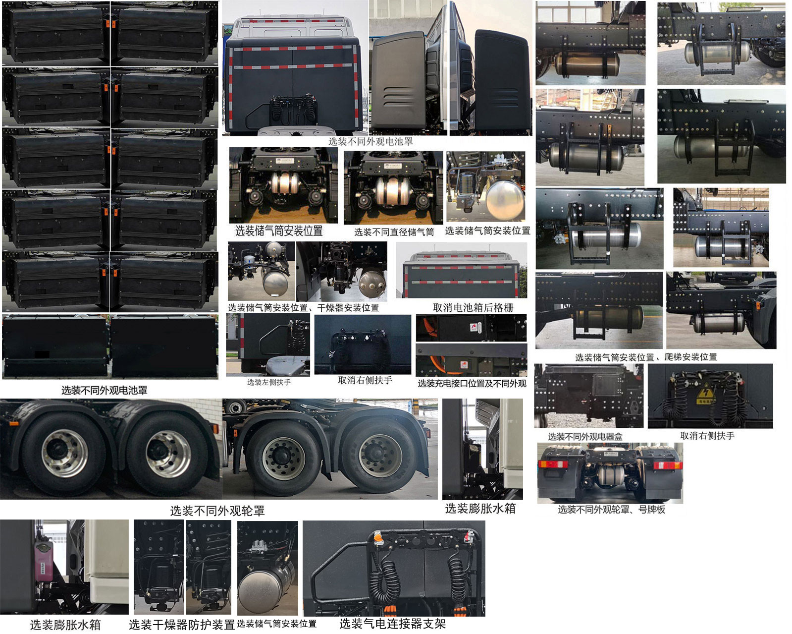 | 备注 | 1.可选装平顶驾驶室、前围造型、导流罩、踏步、不同外观遮阳罩、驾驶室造型、后视镜、360环视系统、不同外观后组合灯、不同外观前雾灯、不同外观电池罩、储气筒安装位置、不同直径储气筒、干燥器安装位置、左侧扶手、充电接口位置及不同外观、不同外观轮罩、膨胀水箱、不同外观电器盒、轮眉、爬梯安装位置、号牌板、气电连接器支架、干燥器防护装置,可取消右侧扶手、电池箱后格栅;2.整备质量(kg)/准拖挂车总质量(kg)/鞍座最大承载质量(kg)对应关系:11400/37470/13470,11600/37270/13270,11900/36970/12970,12100/36770/12770,11100/37770/13770. | ||||||||||
