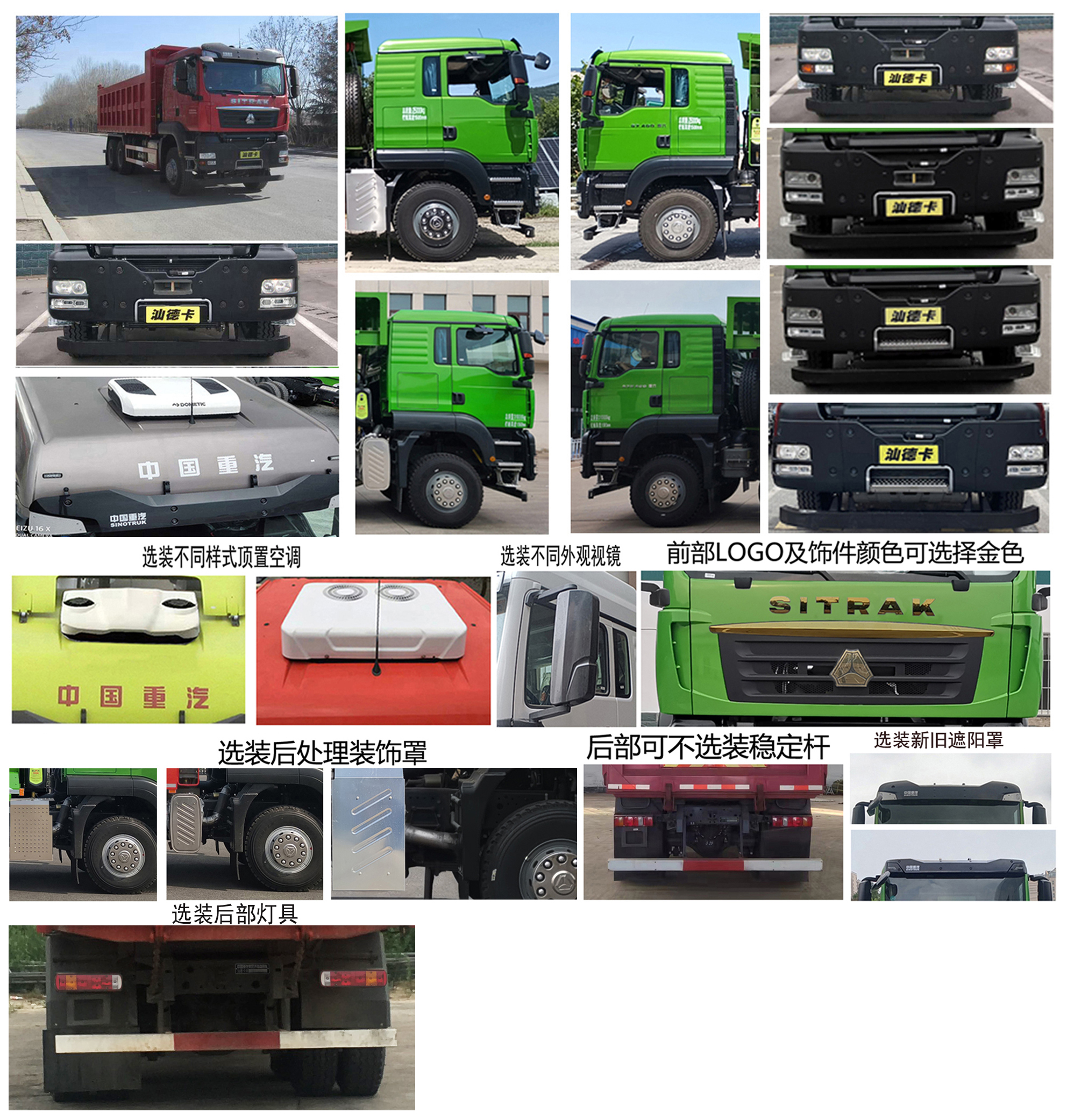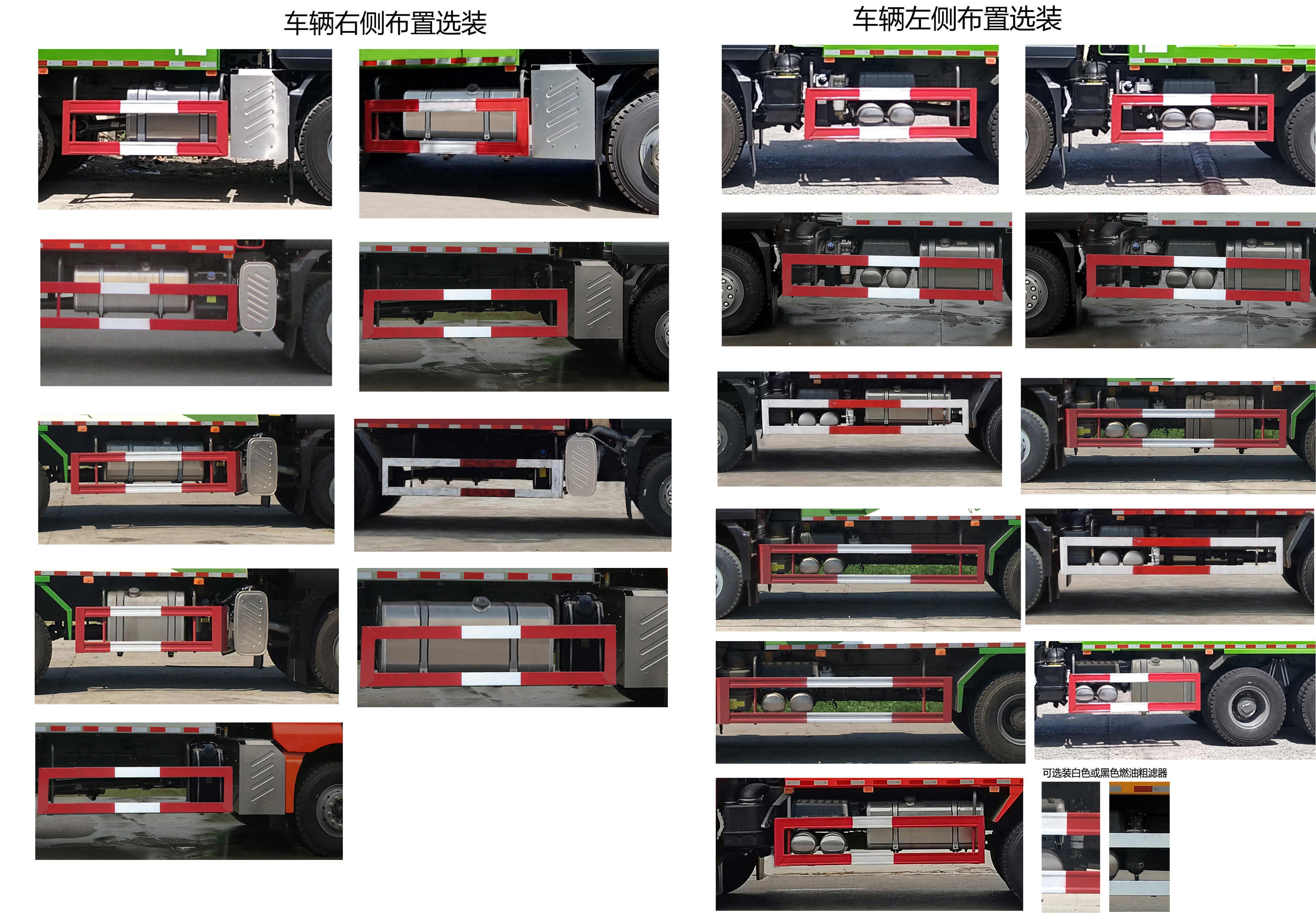 备注 | 1.选装驾驶室。选装货厢外观结构。选装环保盖。货箱自卸方式为后卸。2.选装翼子板造型;选装尿素箱、电瓶、储气筒布置方式;选装新灯新号牌板组合;选装金色LOGO。选装尾灯。选装后处理装饰罩,选装后视镜,选装顶置空调;选装油箱安装位置。3.制动器衬片更换报警装置仅适用于盘式制动器。 | ||||||||||