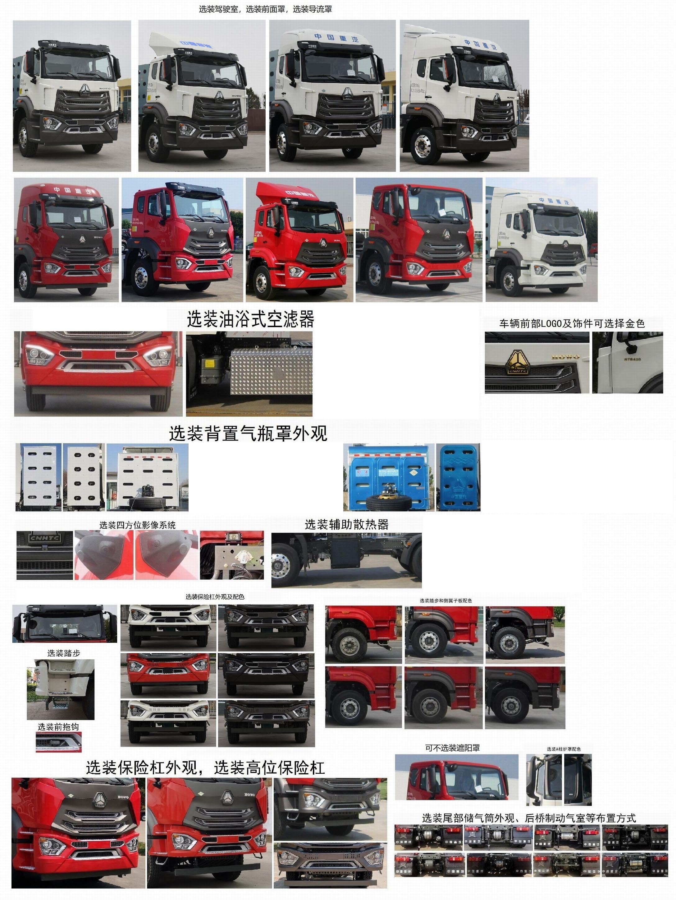 | 备注 | 该车选装半高顶驾驶室,带导流罩时整车高度为3880mm,不带时为2900mm或3000mm或3090mm或3320mm;选装高顶驾驶室,带导流罩时整车高度为3790mm,不带时为3500mm。选装高位保险杠。选装保险杠外观。选装踏步。可不选装遮阳罩。选装油浴式空滤器。选装四方位影像系统。选装尾部储气筒外观。选装后桥制动气室布置方式。尾梁下方的储气筒可置于车架内侧。选装前面罩。选装踏步和侧翼子板配色。选装A柱护罩配色。选装辅助散热器。选装侧防护。整备质量10100kg对应鞍座载质量14770kg,对应准拖挂车总质量38700kg;整备质量10500kg对应鞍座载质量14370kg,对应准拖挂车总质量38300kg。可选装气瓶罩外观。可不选装气瓶罩。选装前拖钩。选装后桥制动气室等布置方式。安装具有卫星定位功能的行驶记录仪。选装ETC车载装置。可选装气瓶罩外观。可不选装气瓶罩。选装前拖钩。选装后桥制动气室等布置方式。安装具有卫星定位功能的行驶记录仪。前回转半径、与半挂牵引车匹配的半挂车前回转半径、牵引座中心至半挂牵引车辆最前端的距离、与半挂牵引车匹配的半挂车牵引销中心轴线到半挂车最后端水平距离的对应关系为:1940/1860/5780/11320;2235/2040/6155/10945。 | ||||||||||