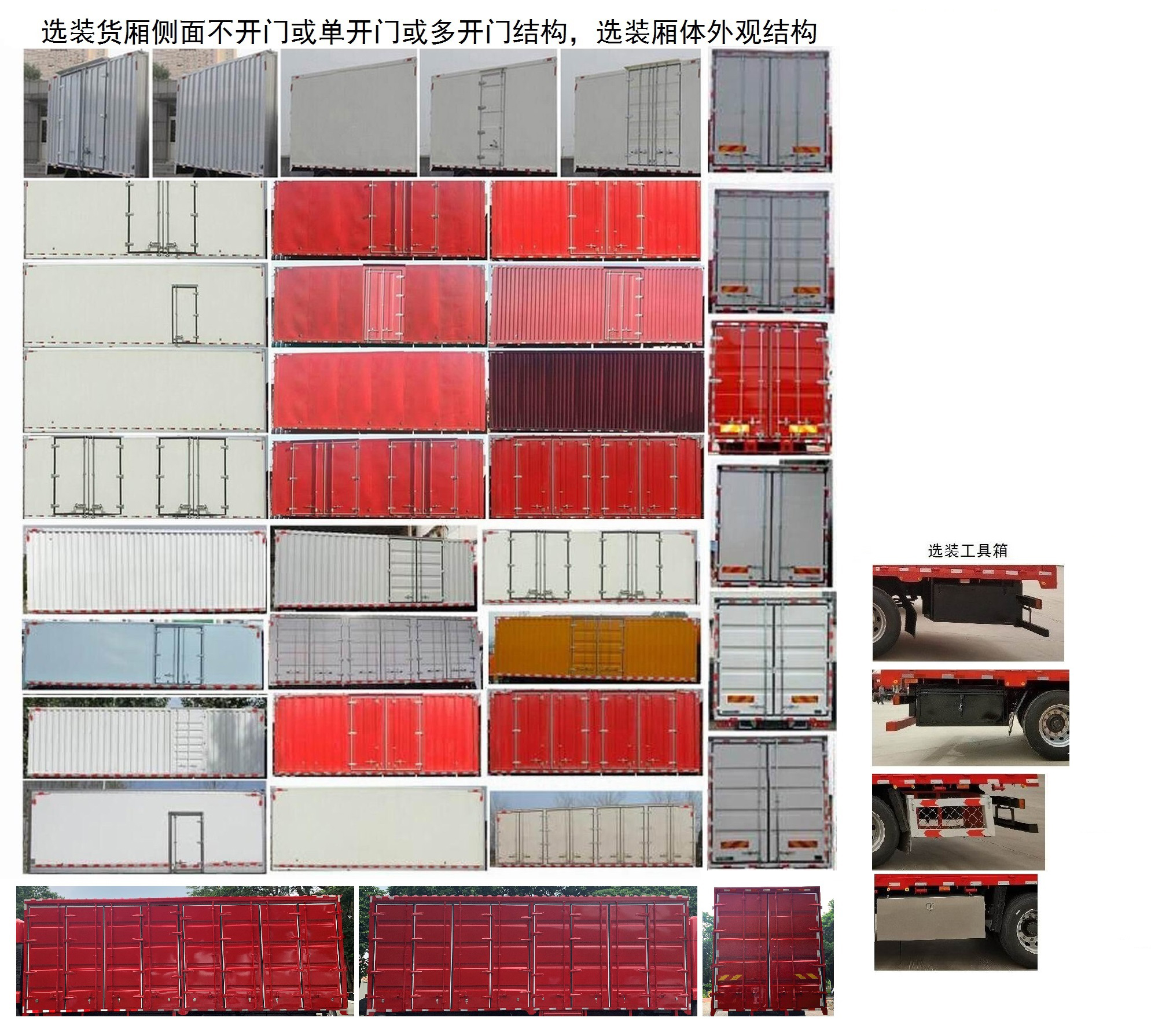 | 备注 | 该车选装半高顶或高顶驾驶室。可选装导流罩。选装昼间行驶灯。选装左置电瓶箱。选装油浴式空滤器。选装保险杠外观。选装高位保险杠。选装踏步。选装前拖钩。选装四方位影像系统。车长与前悬、轴距、后悬、货厢内长尺寸对应关系如下(单位:mm):8120=1550+4500+2070,货厢内长5800;8320=1550+4500+2270,货厢内长5800;8500=1550+4700+2250,货厢内长6200;8700=1550+4700+2450,货厢内长6200;9000=1550+5100+2350,货厢内长6700或6750;10120=1550+5600+2970,货箱内长7800;10350=1550+6000+2800,货箱内长8000;10620=1550+6000+3070,货箱内长8300。车厢顶部封闭,不可开启。选装侧面不开门或单开门或多开门结构。选装货厢外观结构。选装工具箱。安装具有卫星定位功能的行驶记录仪。选装ETC车载装置。 | ||||||||||