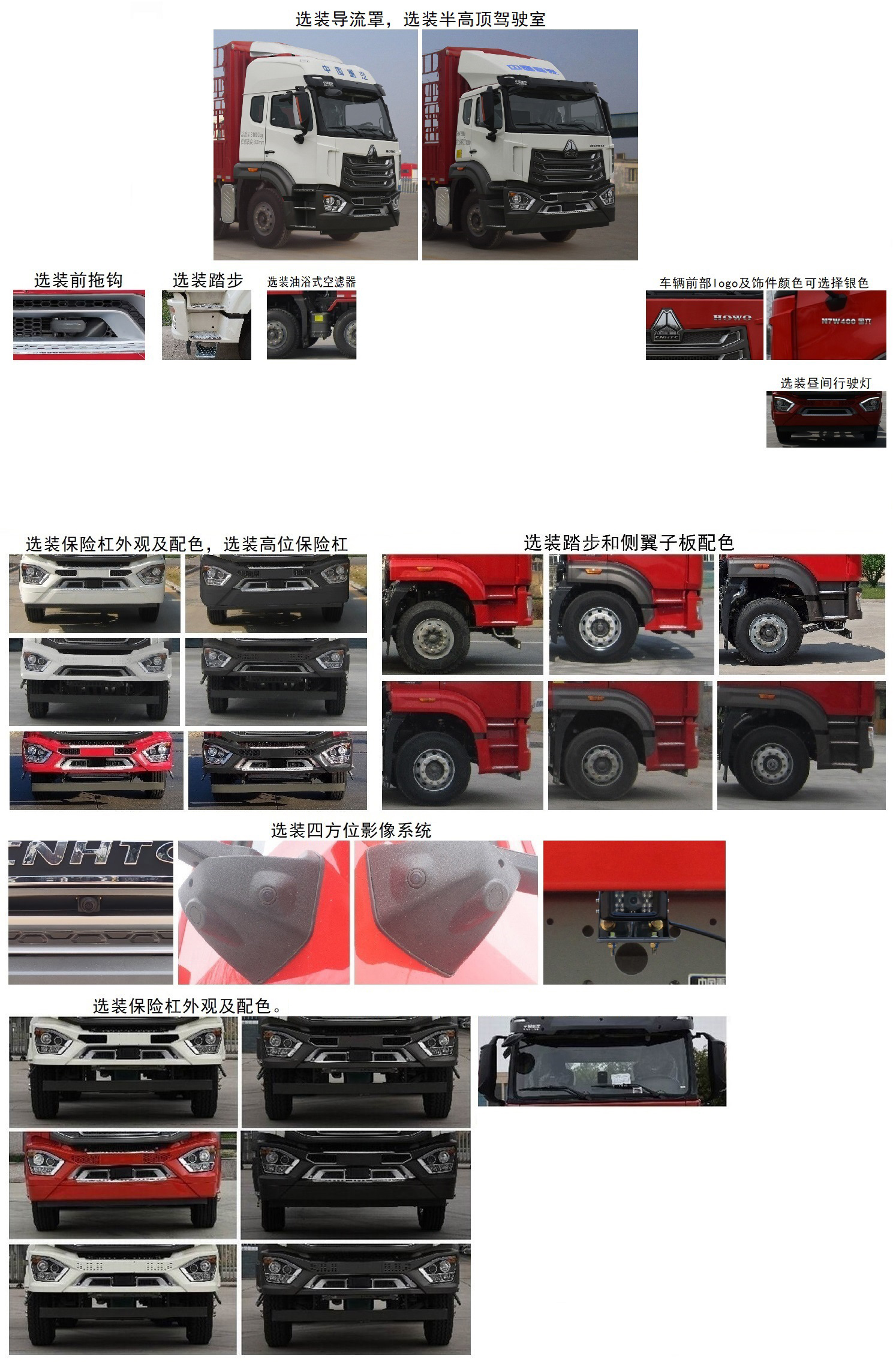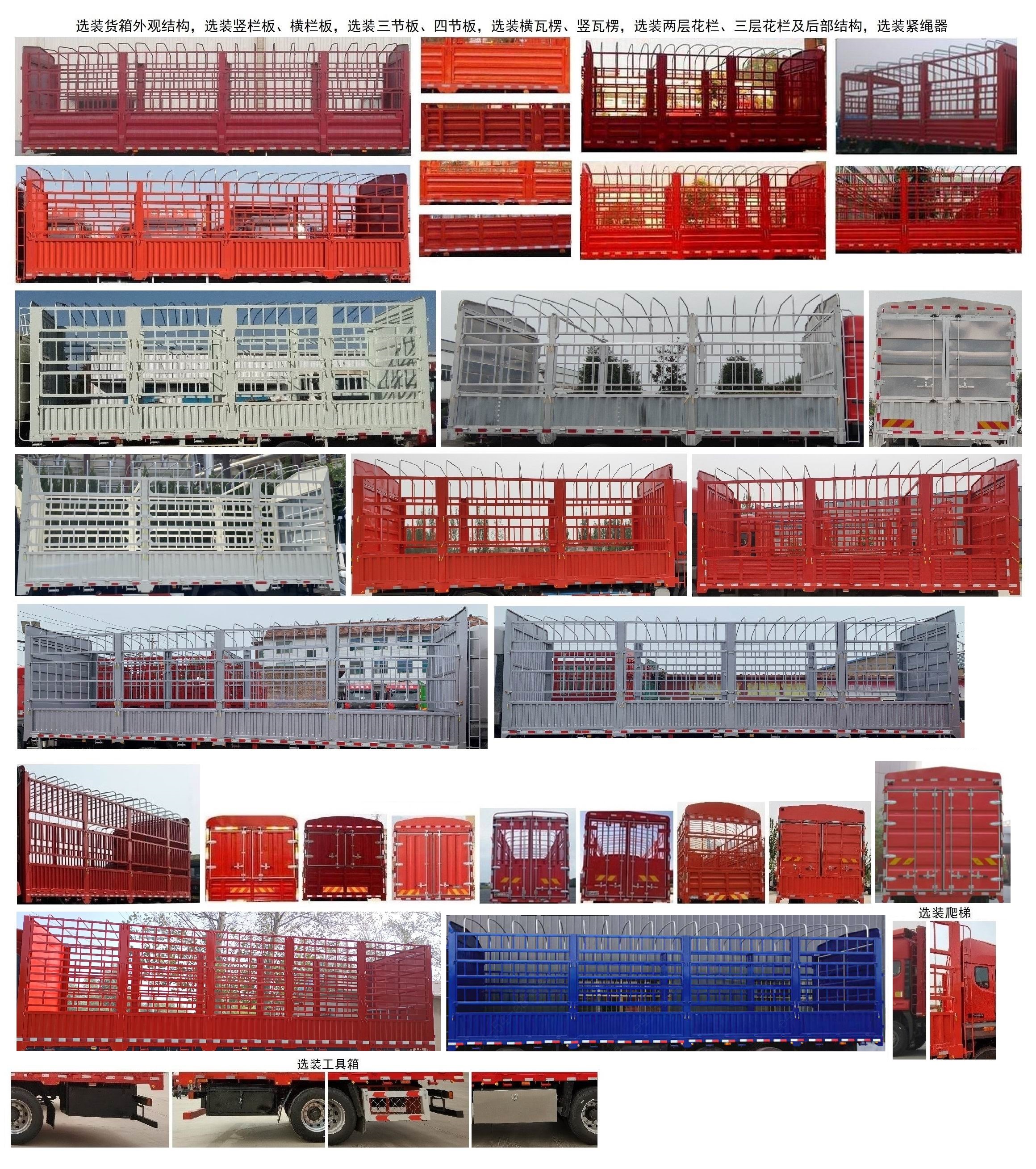 | 备注 | 该车随底盘选装半高顶或高顶驾驶室,同时可选装导流罩。选装昼间行驶灯。选装后视镜。选装保险杠外观。选装高位保险杠。选装踏步。选装前拖钩。选装四方位影像系统。该车可选装油浴式空滤器。仓栅式车厢车厢底板到顶部高度(mm):2400或2500或2550或2600。选装货箱外观结构。选装竖栏板,横栏板,选装三节板,四节板,选装横瓦楞,竖瓦楞,选装两层花栏,三层花栏及后部结构。选装紧绳器。选装工具箱。选装爬梯。安装具有卫星定位功能的行驶记录仪。车辆前部logo及饰件颜色可选择银色。车辆第三轴为可提升桥,仅允许空载状态下提升。 | ||||||||||